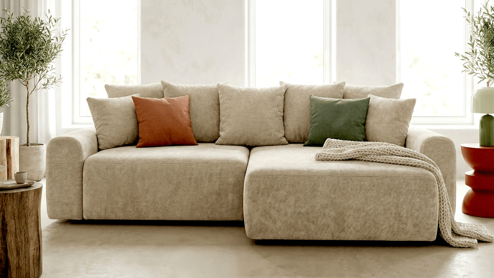 Canapé d'angle convertible 4 places - Monceau• Angle réversible permettant d’installer le canapé à droite ou à gauche selon l’agencement de votre pièce.• Couleur : Beige• Revêtement : Velours côtelé 380 g/m² certifié Oeko-Tex® - Pet Friendly, testé pour limiter la présence de substances nocives et offrir un contact plus sûr au quotidien• Structure : Bois...