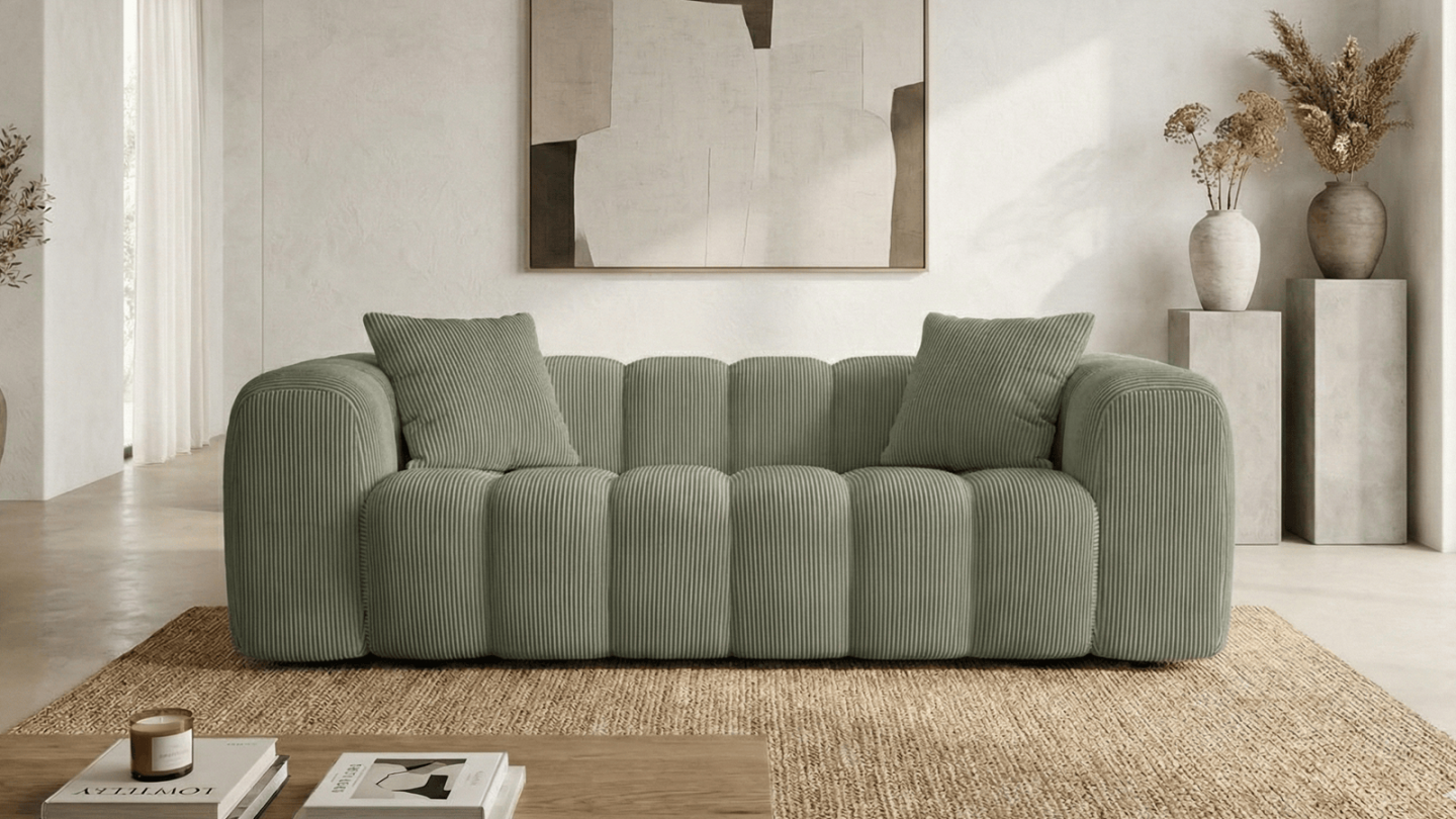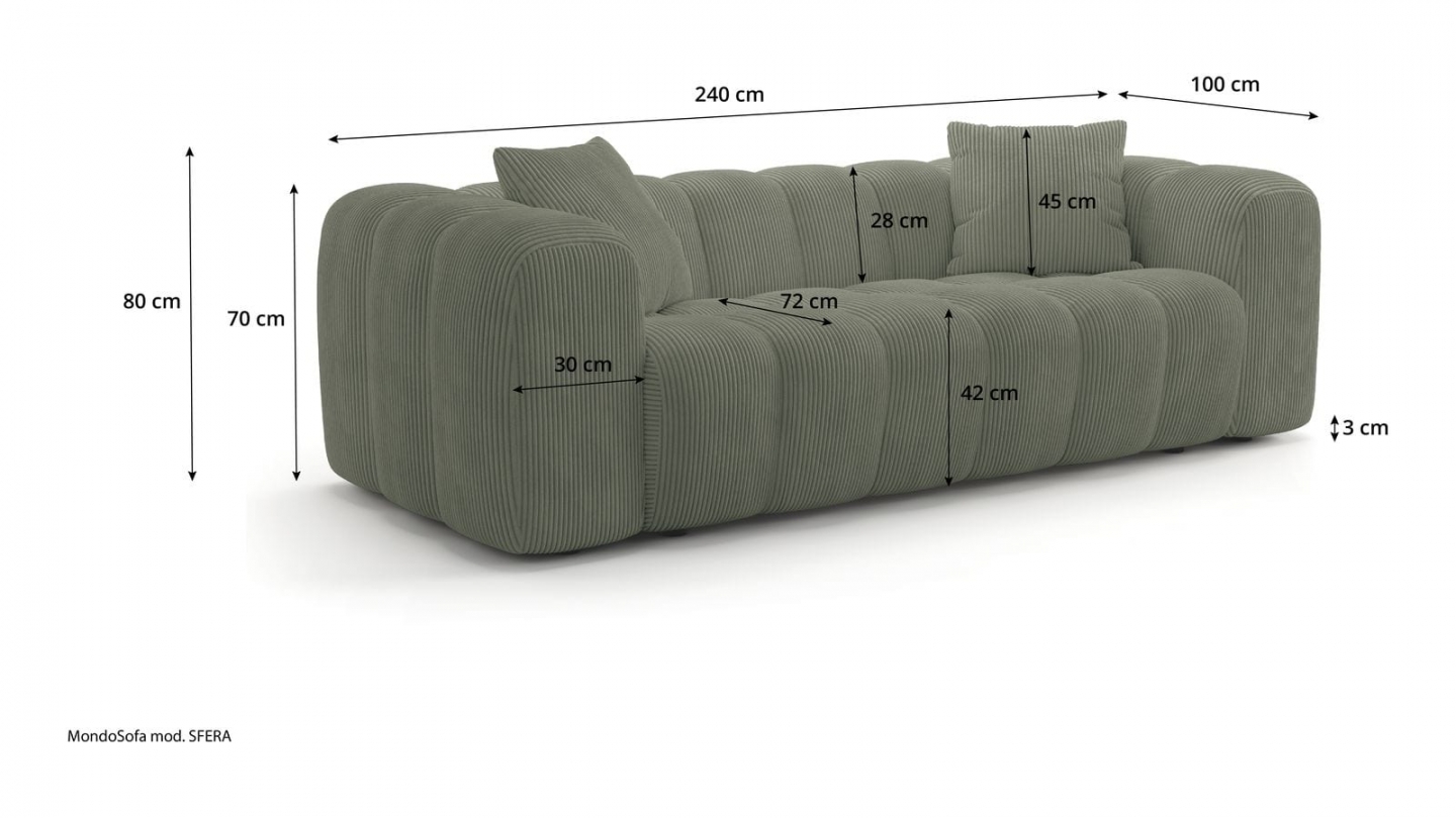 Canapé 3 places - Nuvola• Couleur : Beige• Revêtement : Velours côtelé 380 g/m² certifié Oeko-Tex®, testé pour limiter la présence de substances nocives et offrir un contact plus sûr au quotidien• Structure : Bois• Garnissage : Mousse de polyuréthane 28 Kg/m3, avec accueil moelleux et soutien ferme pour une assise équilibrée.• Largeur d'assise : 180 cm -...