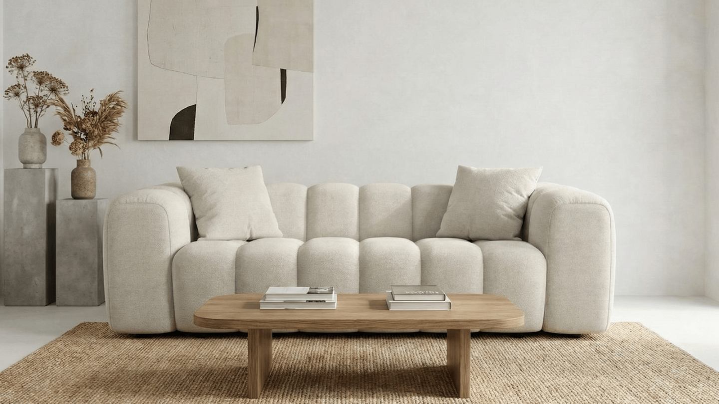 Canapé 3 places - Nuvola• Couleur : Beige• Revêtement : Velours côtelé 380 g/m² certifié Oeko-Tex®, testé pour limiter la présence de substances nocives et offrir un contact plus sûr au quotidien• Structure : Bois• Garnissage : Mousse de polyuréthane 28 Kg/m3, avec accueil moelleux et soutien ferme pour une assise équilibrée.• Largeur d'assise : 180 cm -...