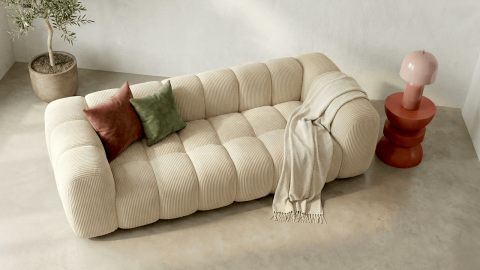 L’entretien est simple grâce au velours côtelé de qualité certifié Oeko-Tex®, permettant de préserver la douceur et l’élégance du tissu au fil du temps. Avec des dimensions totales de 240 x 100 x 80 cm, le canapé Nuvola s’adapte facilement à différents salons, offrant à la fois confort et style.