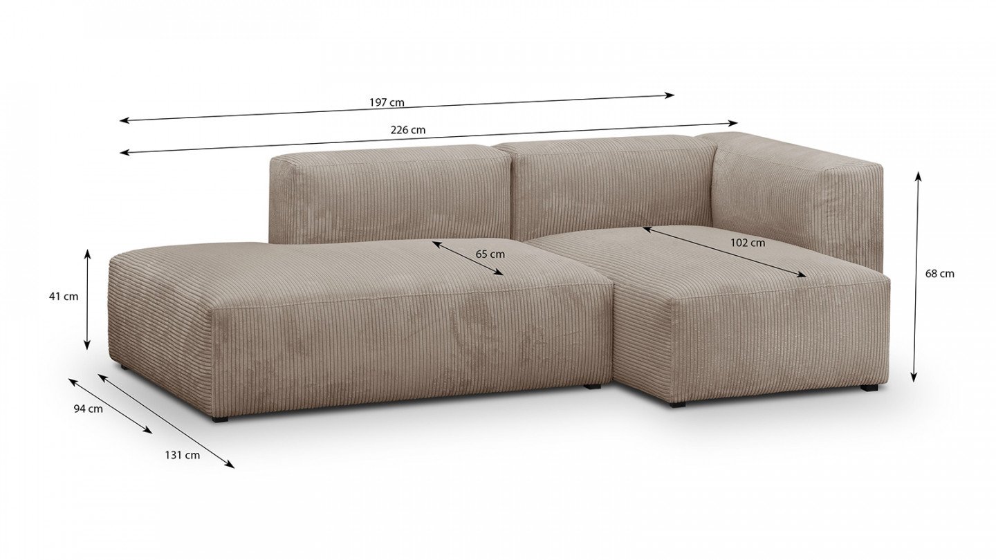 Rupture de stockMéridienne d'angle à droite modulable - Modulo• Module d'assise pour canapé évolutif Modulo. Peut s'utiliser seul ou combiné. Compatible avec tous les modules de la gamme MODULO• Système d'accroche invisible en métal pour faciliter l'assemblage des modules entre eux• Couleur : beige• Revêtement : Velours côtelé certifié Oekotex• Structure : Pin massif...