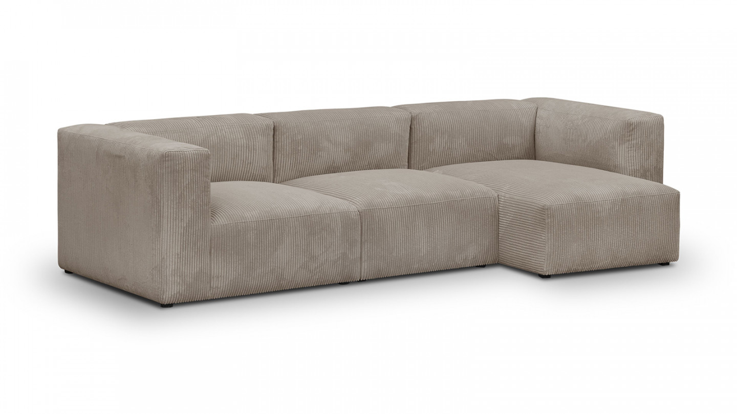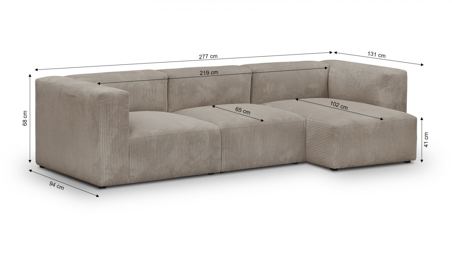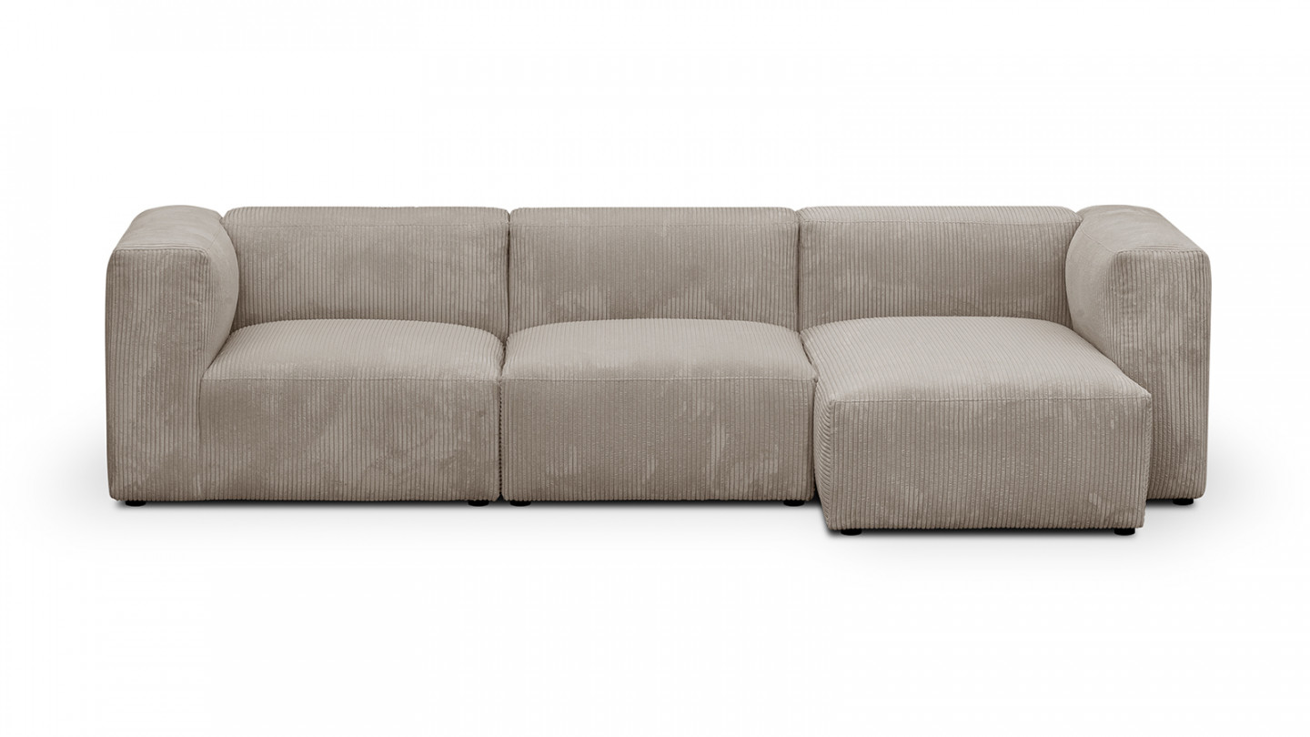 D’une grande élégance, le canapé modulable 4 places avec méridienne à droite Modulo a été confectionné dans un épais tissu de velours côtelé taupe, qui raviva instantanément votre pièce.