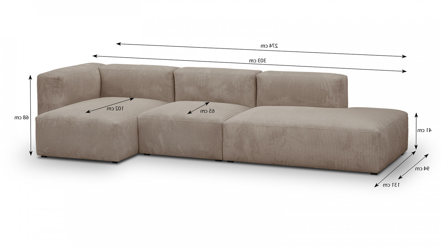Ultra confortable, se canapé Modulo vous propose une largeur d'assise de 274 cm et d'une profondeur d'assise de 65 à 102 cm sur la méridienne. Il vous permettra d’accueillir 5 personnes.