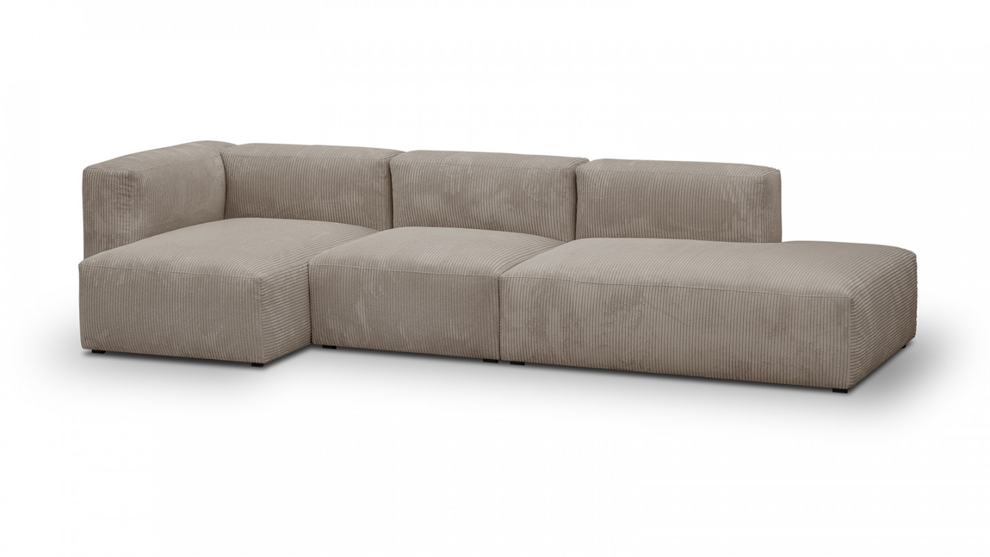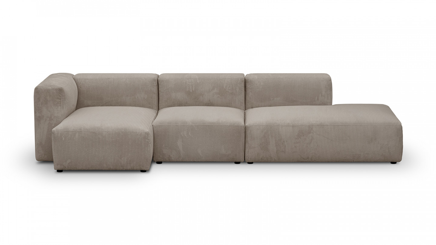 Modules composants le canapé : 1 méridienne d'angle à gauche + 1 chauffeuse sans accoudoirs + 1 module d'angle ouvert à droite
