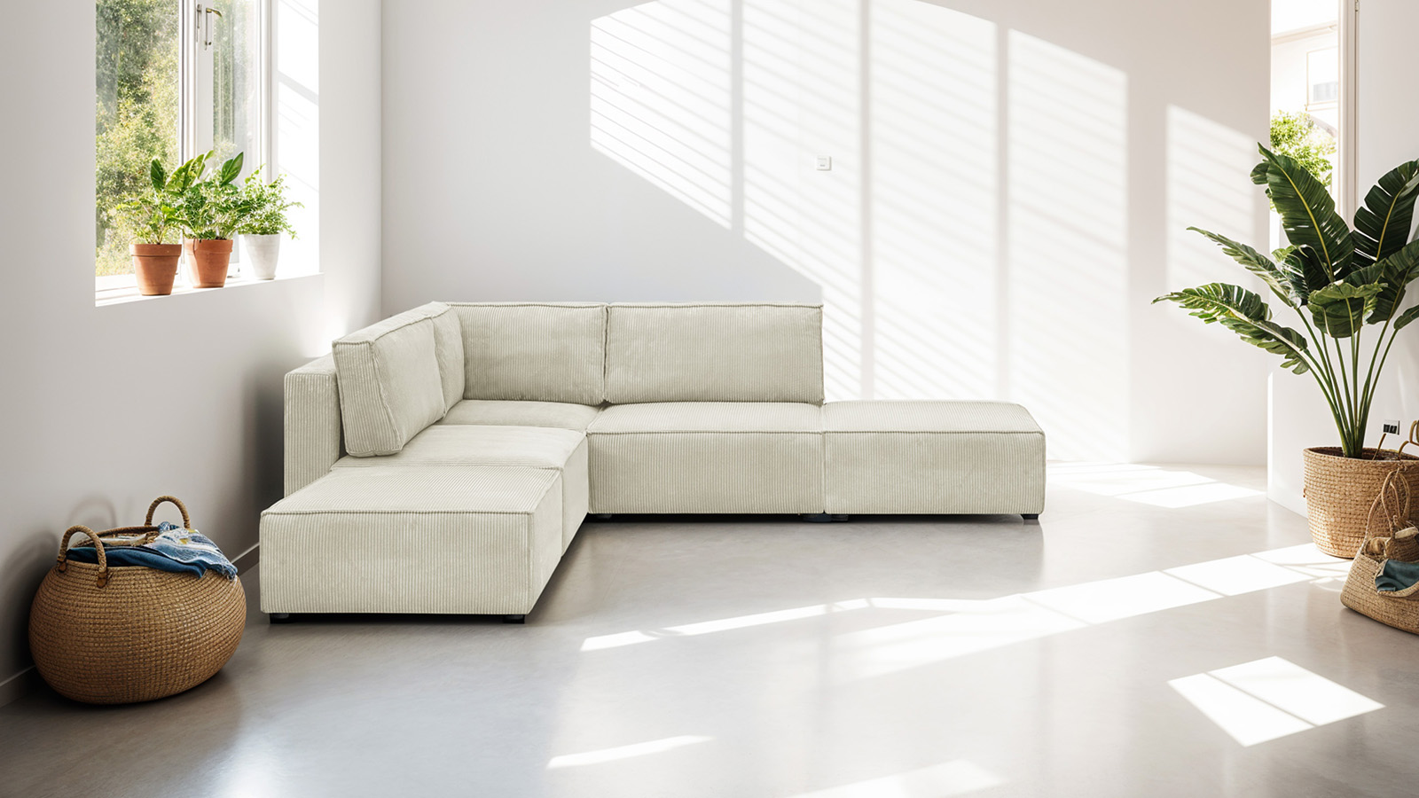 Canapé d'angle modulable 4 places avec 2 poufs en velours côtelé beige