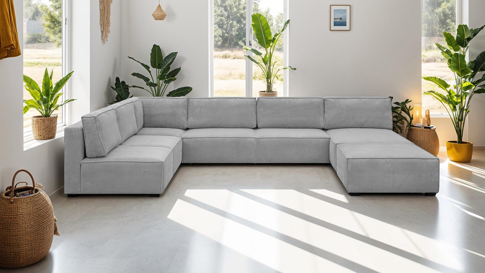 Canapé d'angle convertible panoramique modulable 10 places avec pouf en velours côtelé gris clair