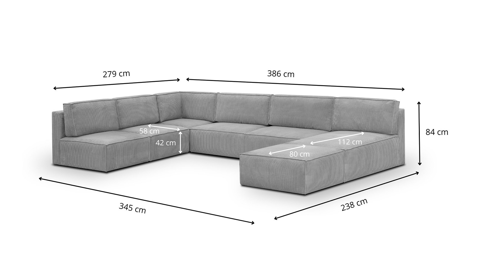 Modules composants le canapé : 1 module d'angle + 1 méridienne + 1 module 2 places + 1 modules 2 places convertible + 1 pouf