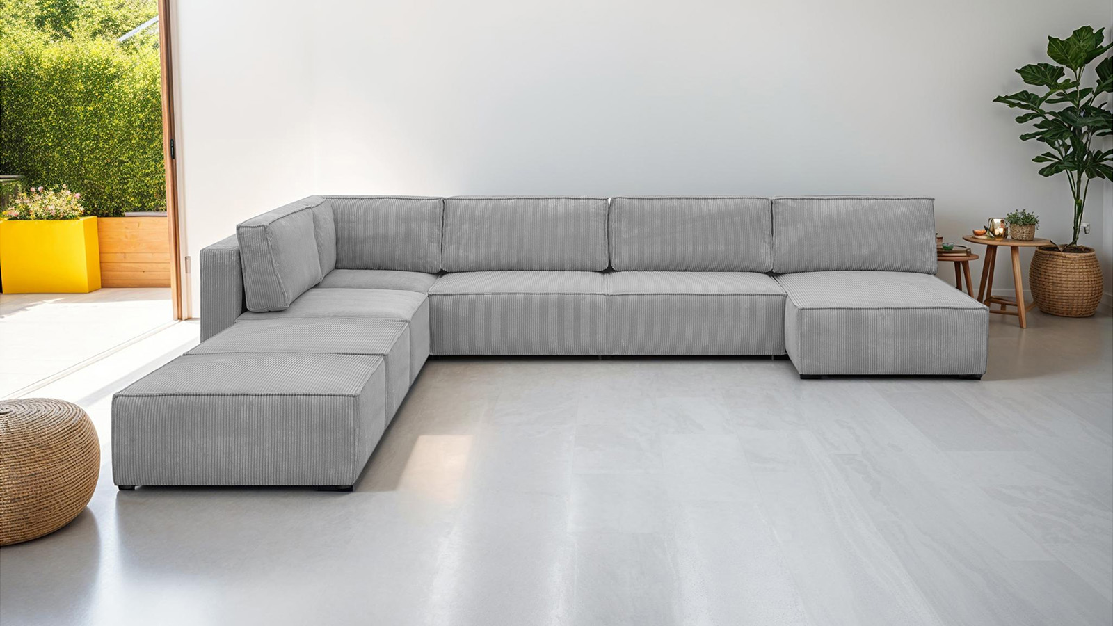 Canapé d'angle modulable panoramique 8 places avec 2 poufs en velours côtelé gris clair