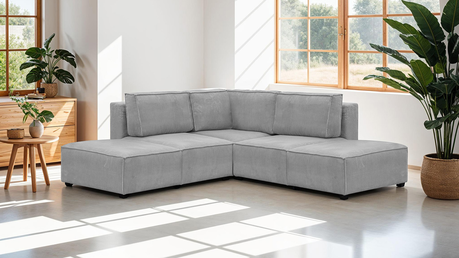 Canapé d'angle modulable 4 places avec 2 poufs en velours côtelé gris clair Confort : équilibré : accueil moelleux, soutien ferme Couleur : gris clair Revêtement : velours côtelé - certifié Oekotex Angle à gauche : se détermine lorsqu'on est face au canapé Structure en bois certifiée FSC Une assise renforcée avec ressorts métalliques plats pour un...