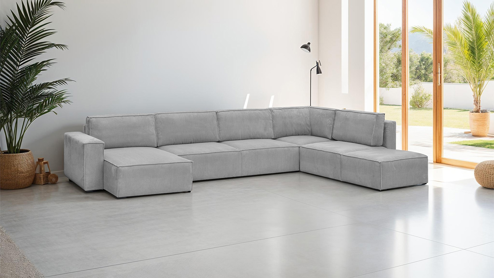 Canapé d'angle panoramique modulable 8 places avec pouf en velours côtelé gris clair