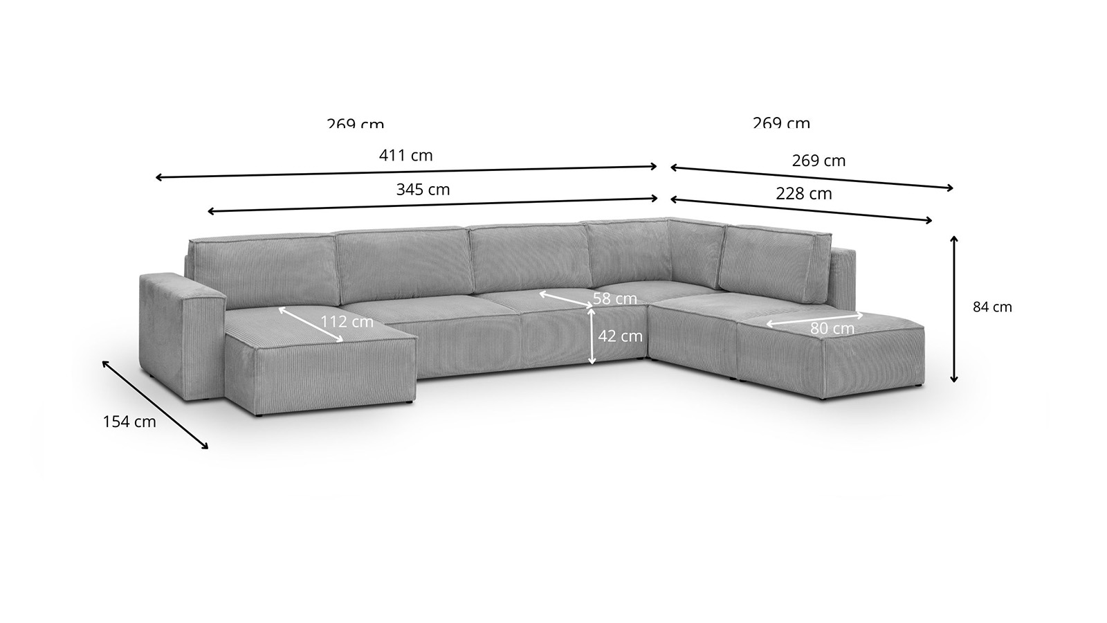 Largeur de l'assise : 515 cm - Hauteur de l'assise : 42 cm - Profondeur de l'assise : 58 cm