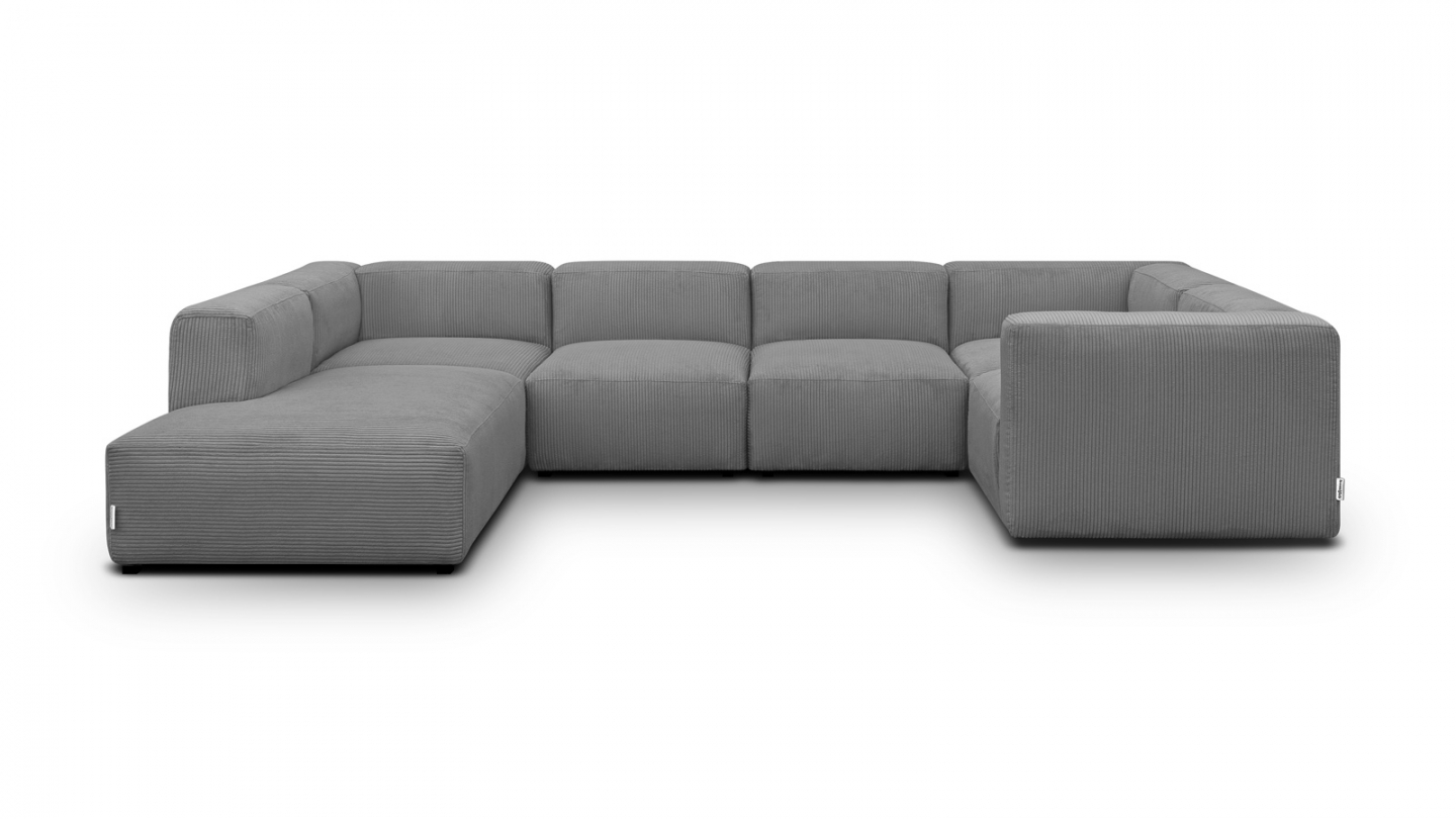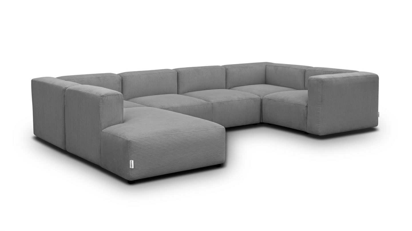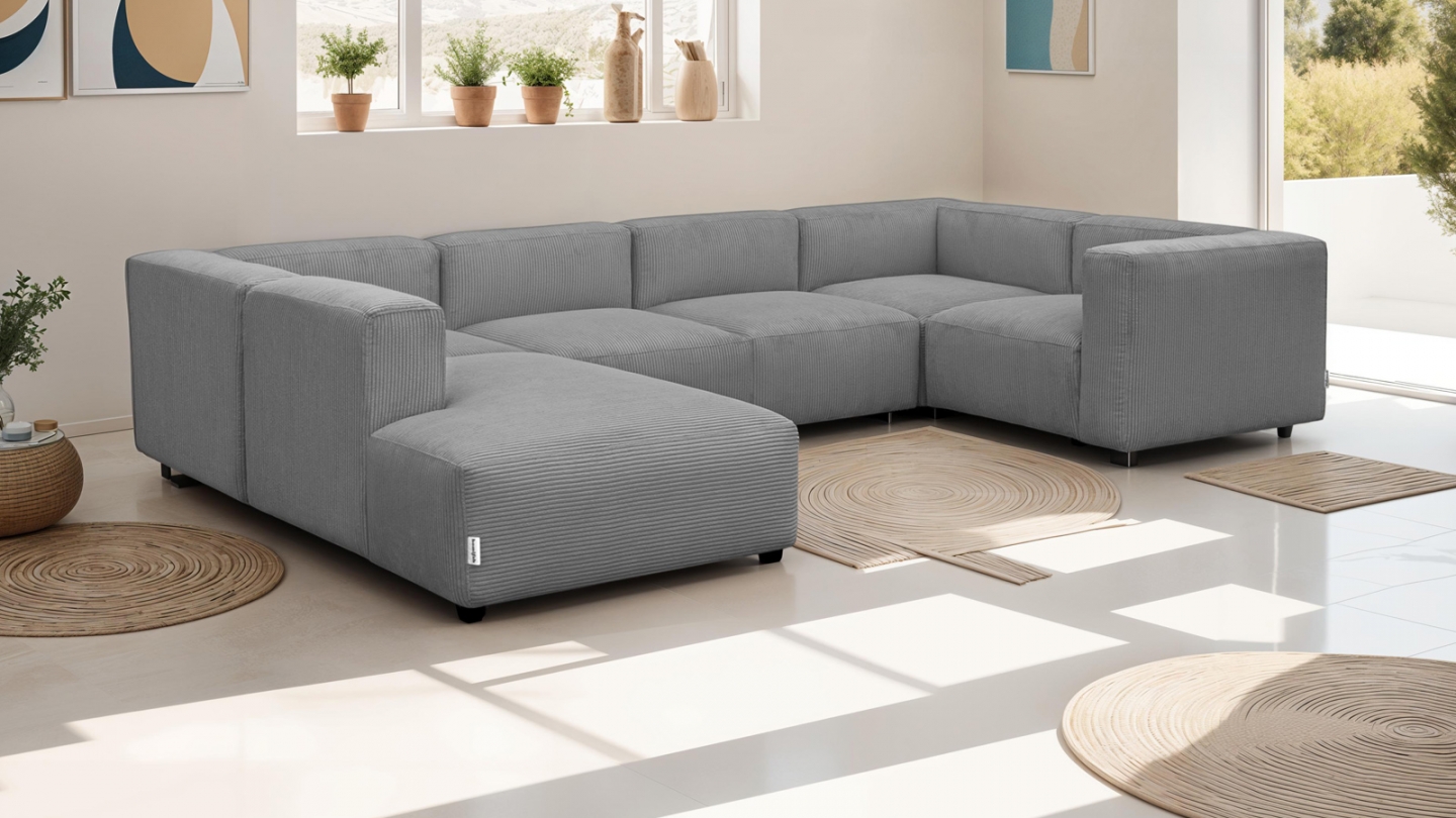 Canapé d'angle modulable panoramique convertible 8 places en velours côtelé gris clair Confort : équilibré : accueil moelleux soutien ferme Couleur : gris clairRevêtement : velours côtelé- certifié Oekotex Angle à gauche : se détermine lorsqu'on est face au canapé Structure en bois certifiée FSC Mousse HR 30 kg/m3: garantit un confort durable, une...