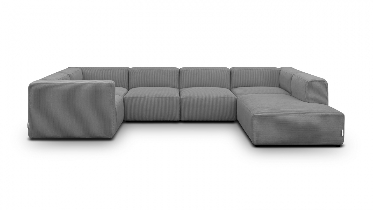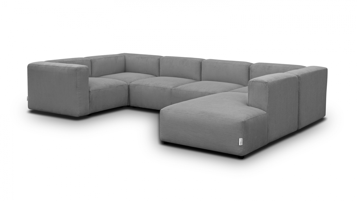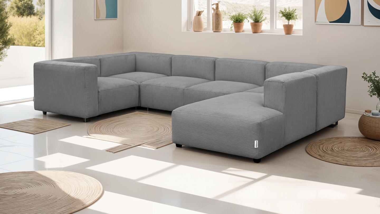 Canapé d'angle modulable panoramique convertible 8 places en velours côtelé gris clair Confort : équilibré : accueil moelleux soutien ferme Couleur : gris clairRevêtement : velours côtelé- certifié Oekotex Angle à gauche : se détermine lorsqu'on est face au canapé Structure en bois certifiée FSC Mousse HR 30 kg/m3: garantit un confort durable, une...