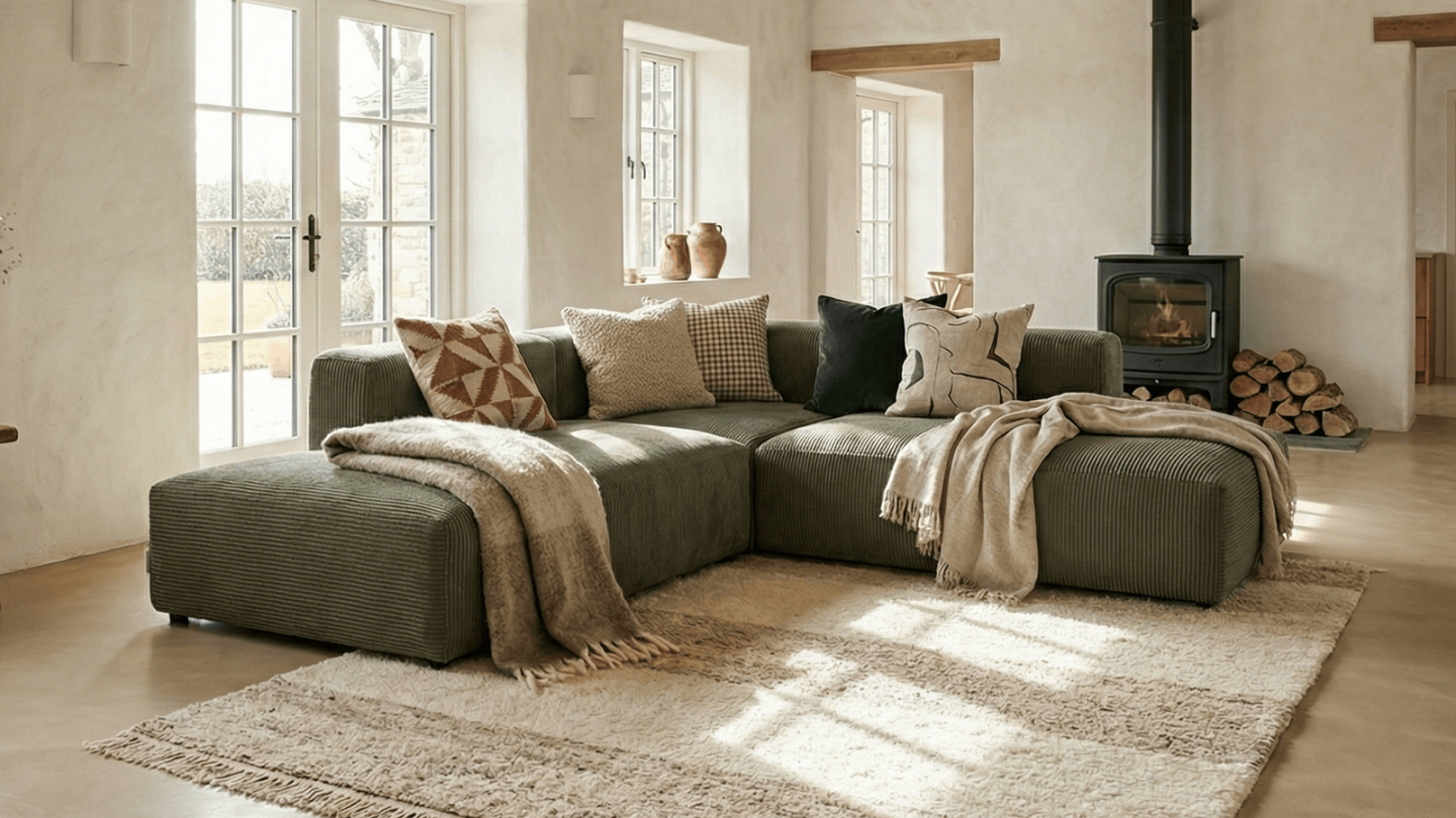 Canapé d'angle modulable 4 places avec 2 poufs en velours côtelé vert kaki Confort : moelleux Couleur : vert kaki Revêtement : velours côtelé - certifié Oekotex Angle à droite : se détermine lorsqu'on est face au canapé Structure en bois certifiée FSC Une assise renforcée avec ressorts métalliques plats pour un meilleur soutien, plus de durabilité et un...