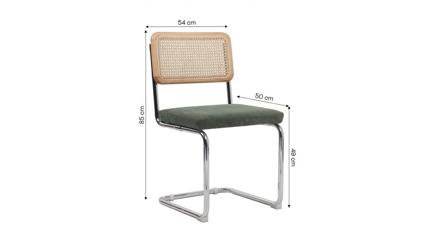 La structure en métal chromé garantit la solidité et la durabilité de ces chaises, tandis que le dossier en hêtre cannage cannage assure un maintien confortable pour votre dos. L'assise en velours côtelé vert vous promet un confort douillet.