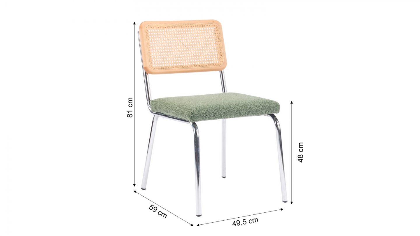 Lot de 2 chaises de salle à manger - Muse• Structure et piètement en métal chromé• Dossier en hêtre et cannage naturel• Assise en Tissu bouclé 600 g/m²• Couleur : Beige• Garnissage de l'assise : Mousse 28 kg / m3• Dimensions totales : 54 x 50 x 85 cm• Largeur de l'assise : 49 cm• Profondeur de l'assise : 41 cm• Hauteur de l'assise : 49 cm