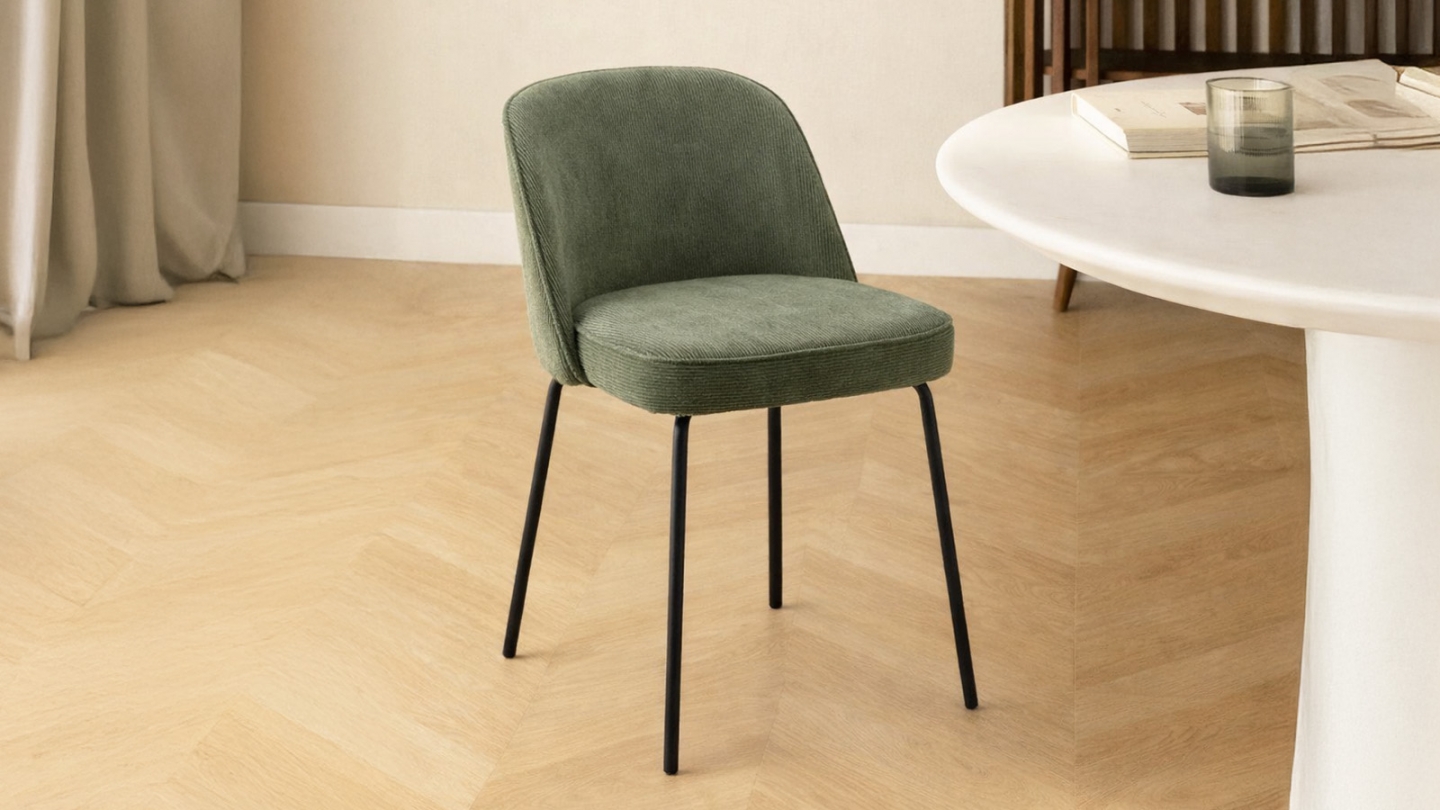 Découvrez notre lot de 2 chaises Olden en velours côtelé vert et leur élégant piètement en métal noir.