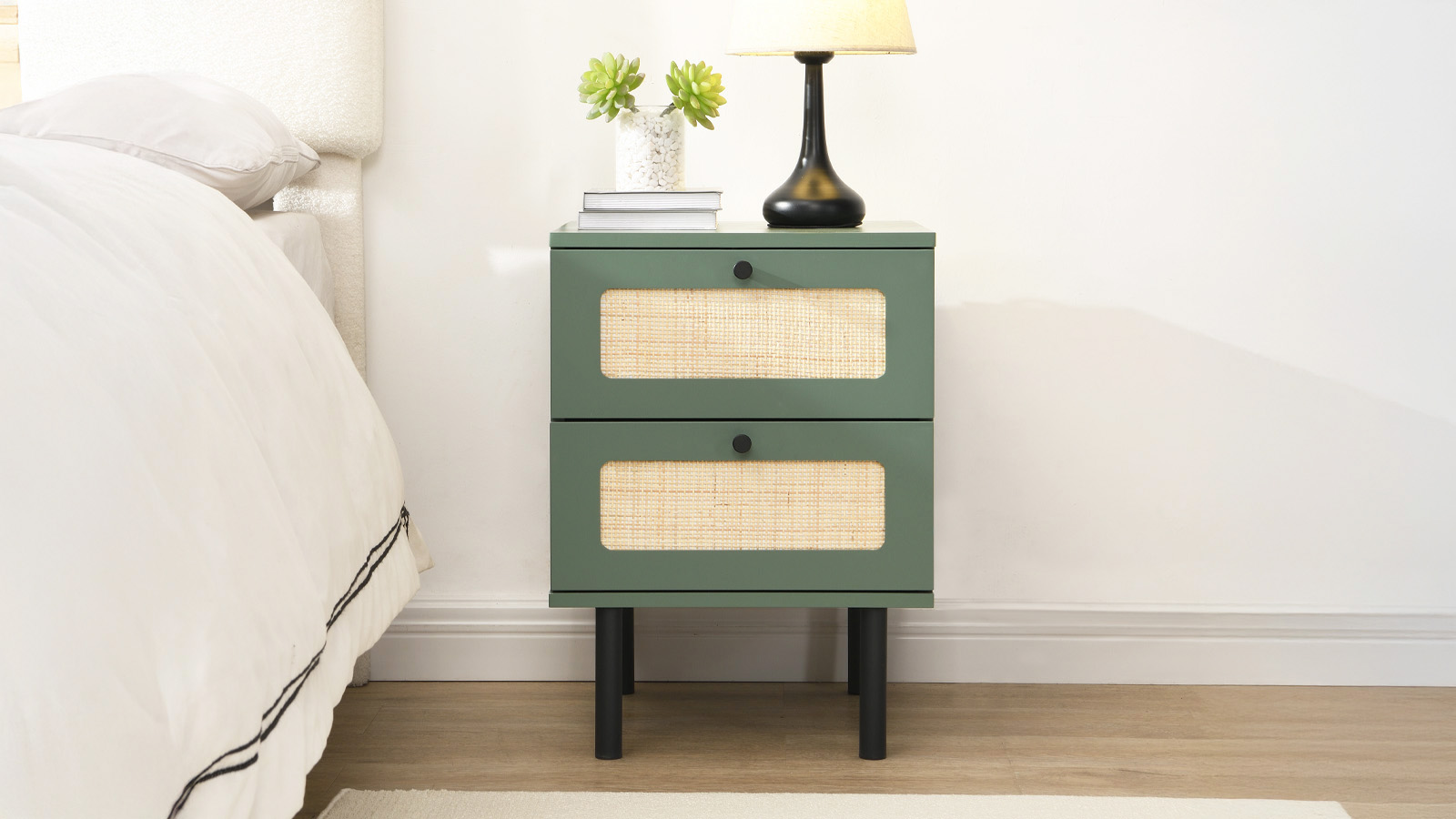 Commode 3 tiroirs - Luma • Matière de la structure : MDF • Couleur : Vert et cannage • Piètement en Metal • Poignées : Métal • Rangements : 3 tiroirs • Dimensions totales : 105 x 40 x 80 cm