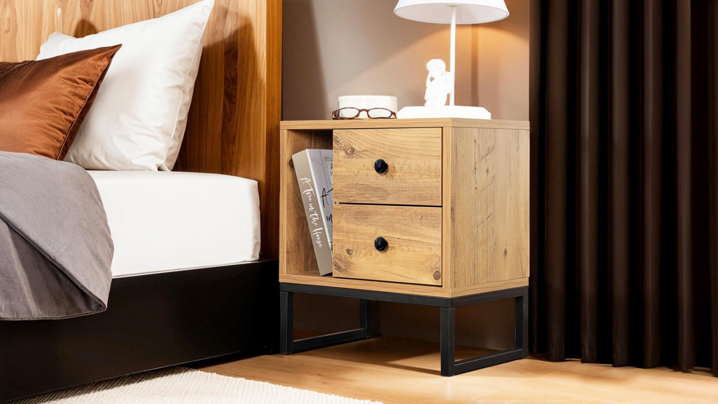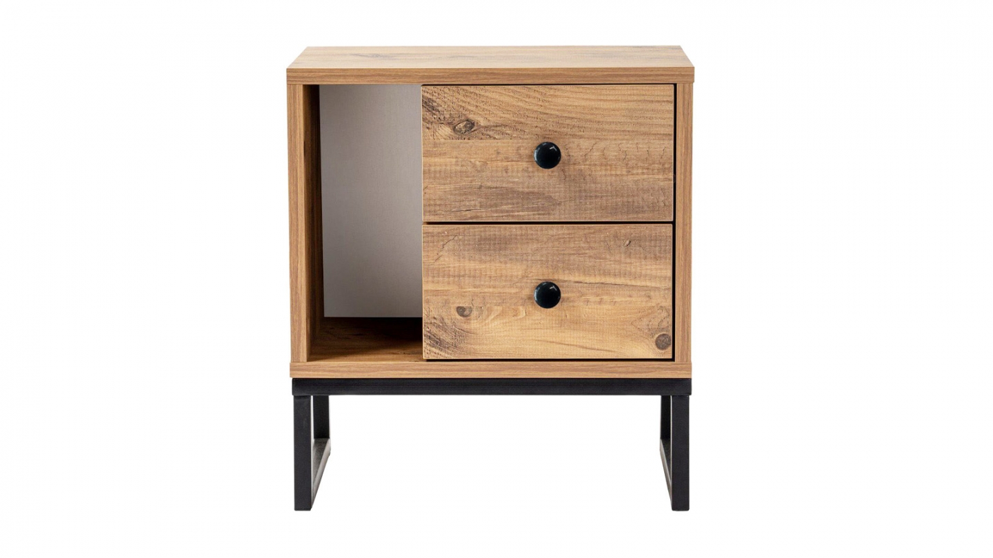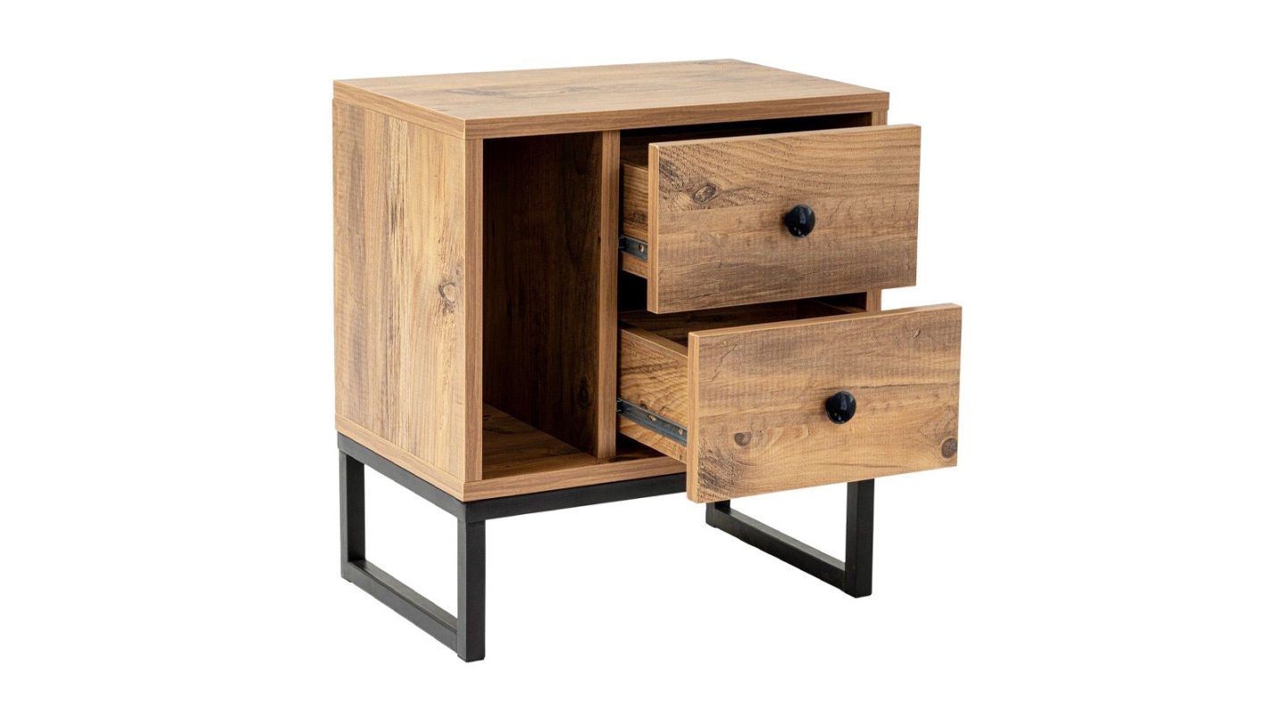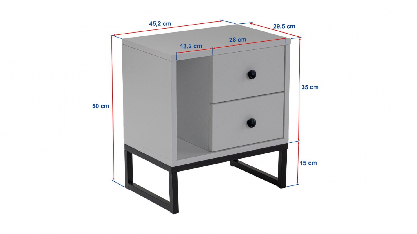 Chevet - Lior• Matière : Mélamine, métal• Couleur : Noir• Rangements : 1 niche, 2 tiroirs• Dimensions totales : 45.2 x 29.5 x 50 cm• Dimensions des tiroirs : 28x29,5x15,5 cm• Dimensions des niches : 13,2x29,5x31,4 cm
