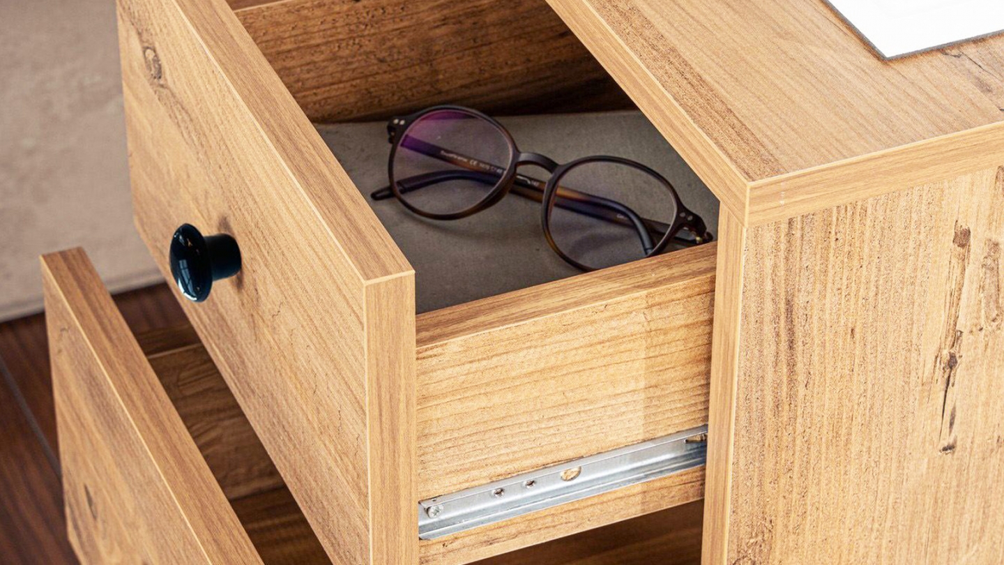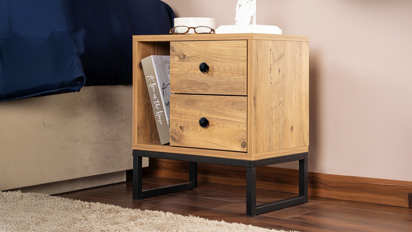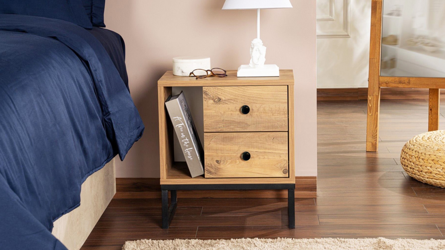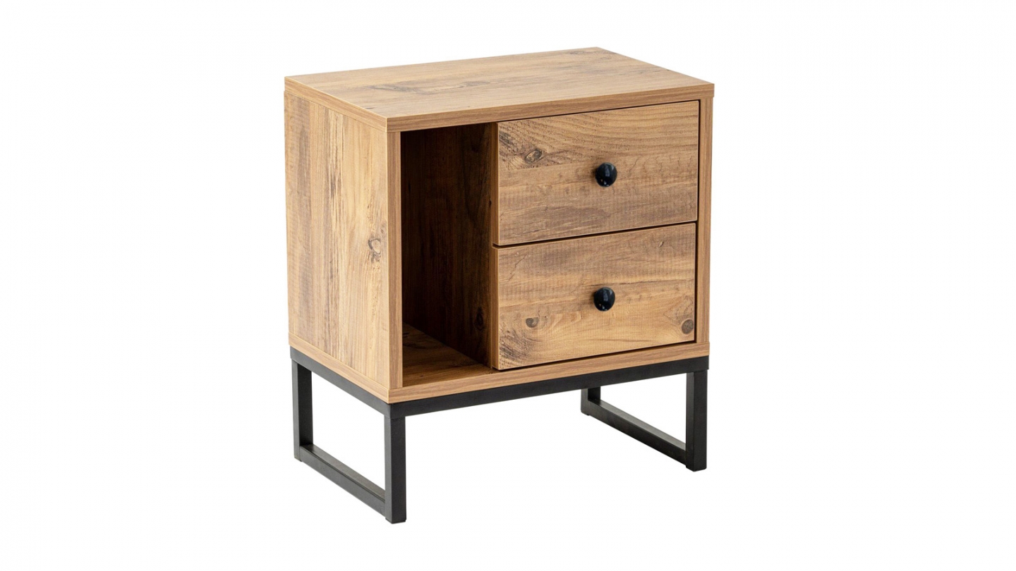 Chevet - Lior• Matière : Mélamine, métal• Couleur : Noir• Rangements : 1 niche, 2 tiroirs• Dimensions totales : 45.2 x 29.5 x 50 cm• Dimensions des tiroirs : 28x29,5x15,5 cm• Dimensions des niches : 13,2x29,5x31,4 cm
