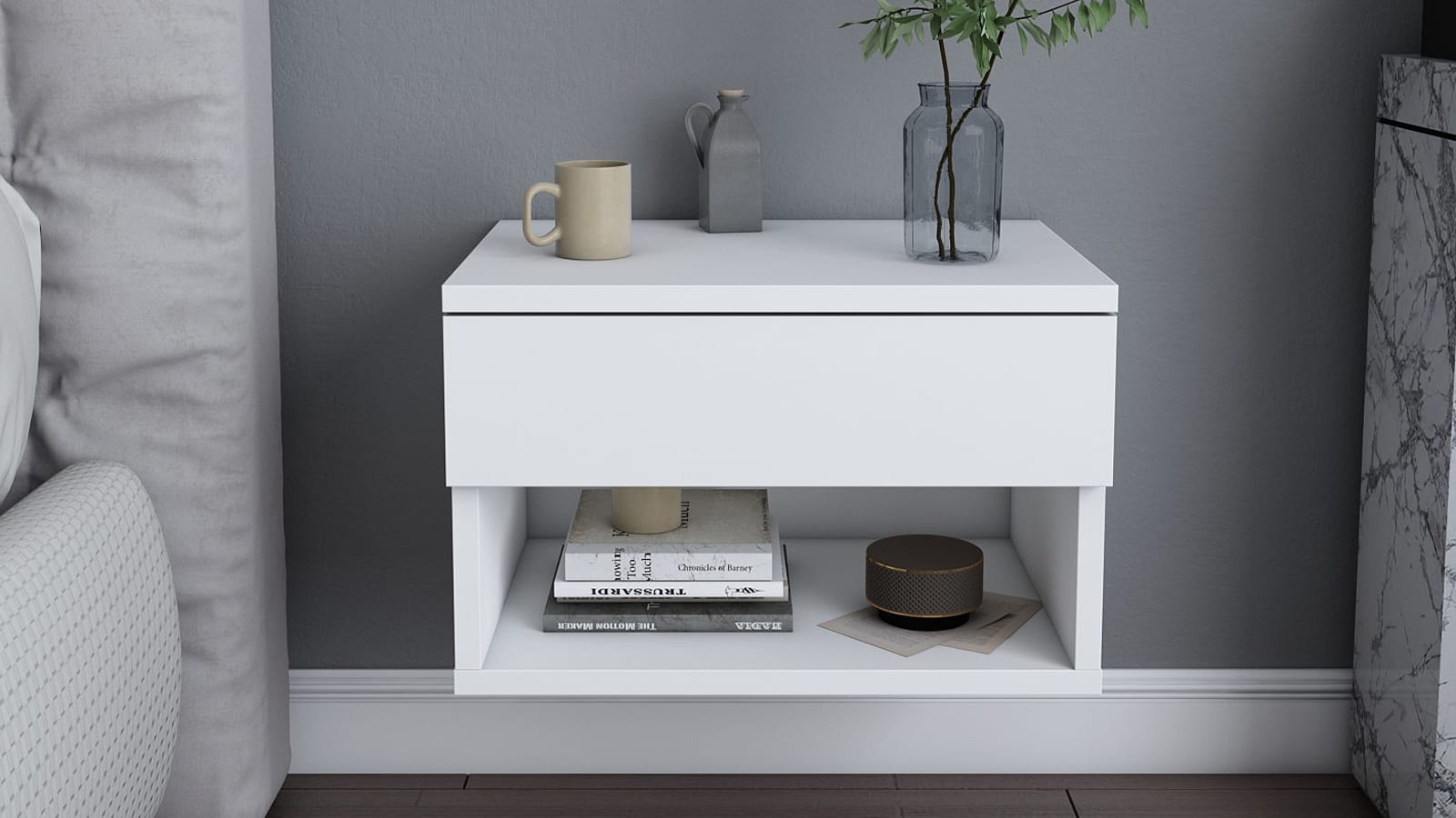 • Table de chevet murale au design moderne, avec tiroir discret et niche ouverte pour un rangement pratique et épuré. A fixer au mur.