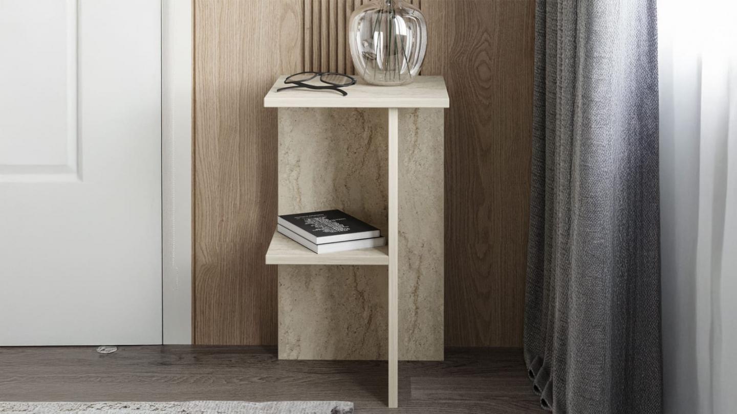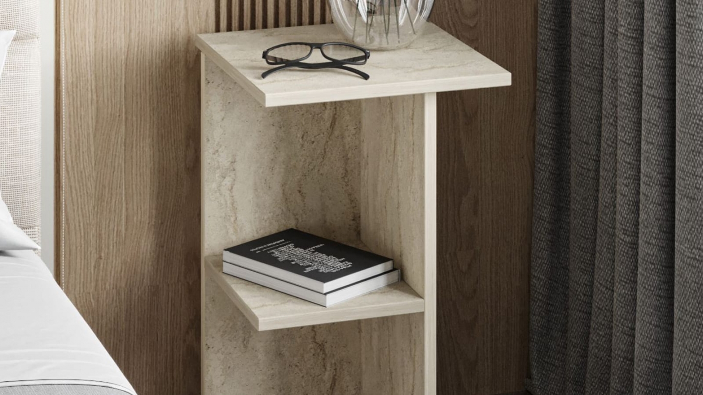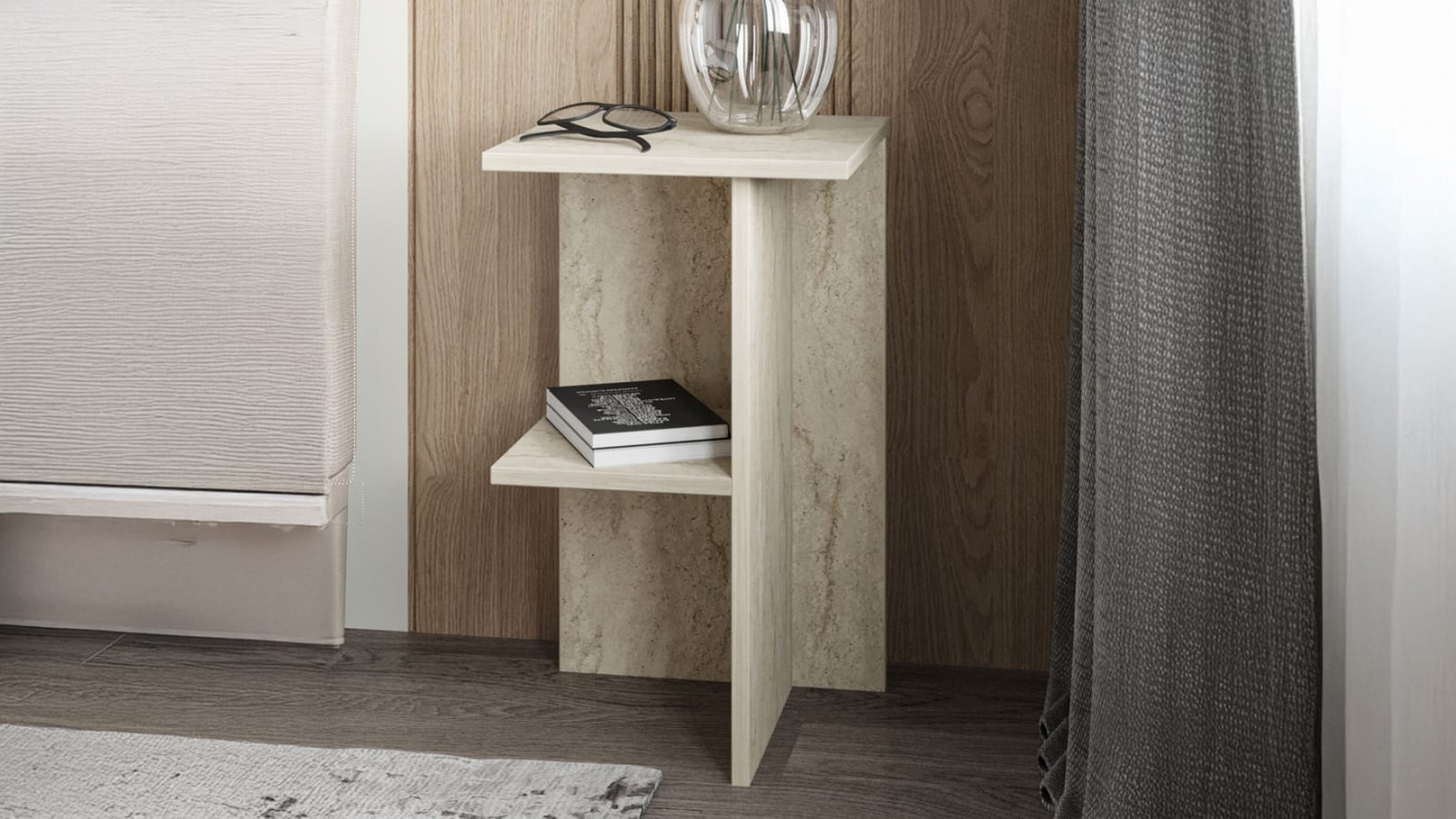 • Table de chevet au design minimaliste effet travertin, parfaite pour apporter une touche naturelle et contemporaine à la chambre tout en offrant un rangement pratique.