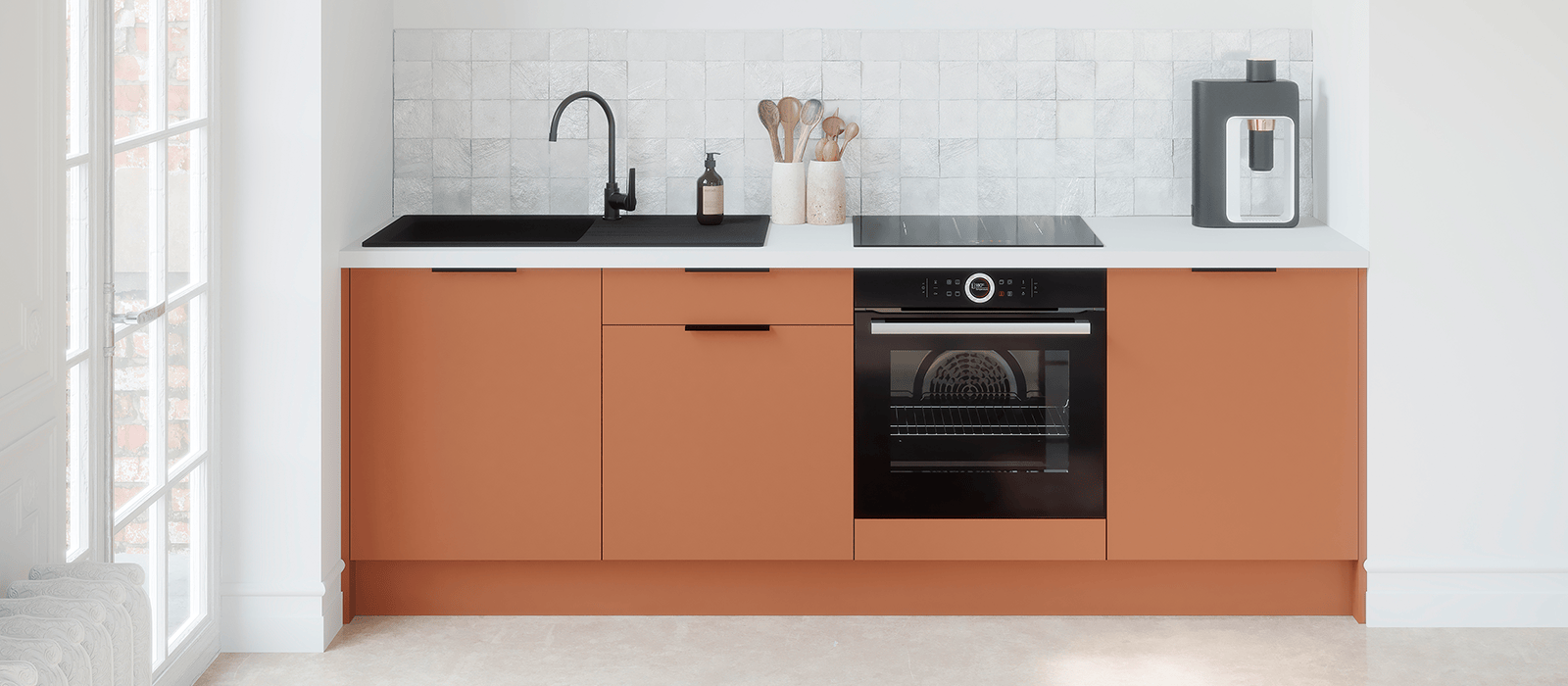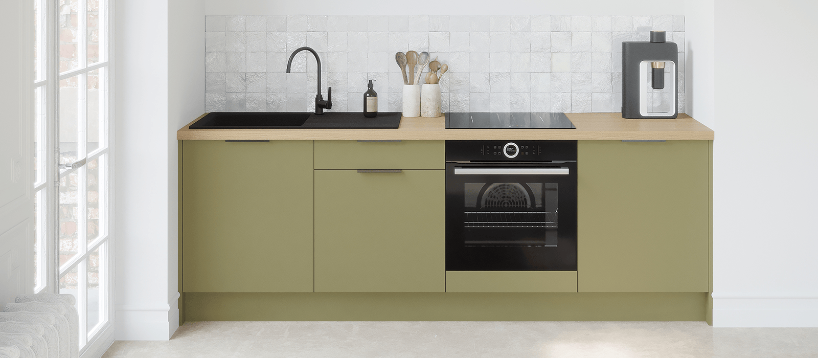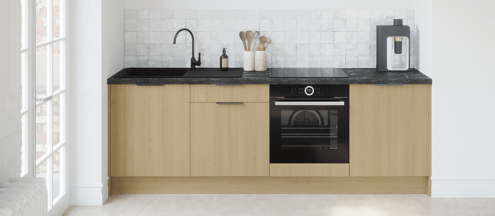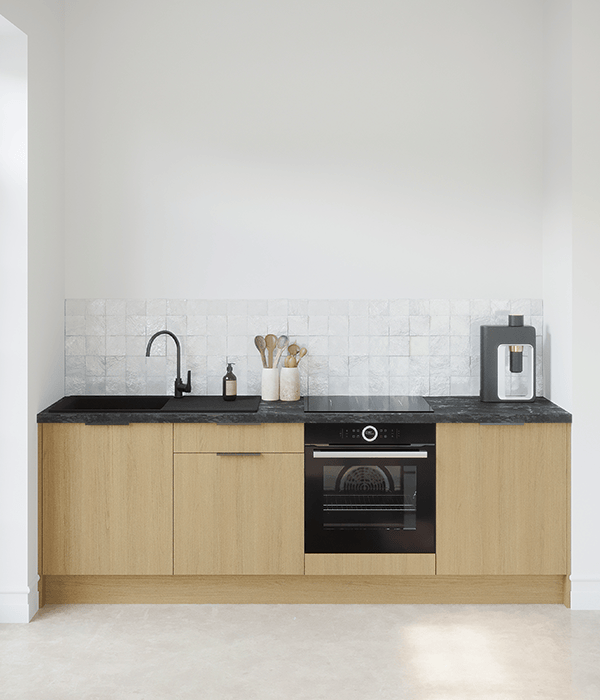 Chaque cuisine est livrée avec des poignées noires mates qui se fixent au verso des façades. Vous pouvez facilement les remplacer par d’autres modèles, si vous le souhaitez.
