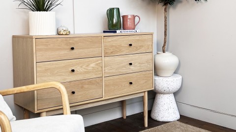 L'association du panneau de particules avec un placage en chêne massif confère à la commode une résistance robuste, assurant ainsi sa durabilité.