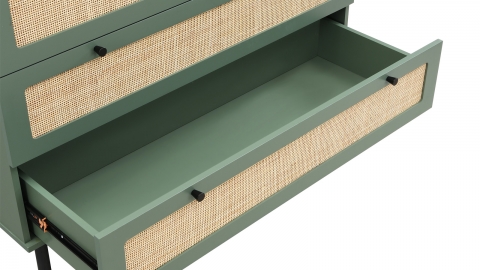 En stockCommode 6 tiroirs - Luma • Matière de la structure : MDF • Couleur : Vert et cannage • Piètement en Métal • Poignées : Métal • Rangements : 6 tiroirs • Dimensions totales : 120 x 40 x 90 cm