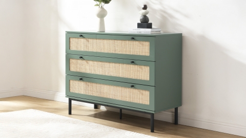 La commode 3 tiroirs Luma séduit par son équilibre entre design contemporain et inspiration naturelle. Sa structure en MDF est sublimée par des façades en cannage qui apportent de la texture et une vraie profondeur visuelle. La teinte verte associée au cannage crée une atmosphère douce et élégante, idéale pour une chambre, un bureau ou une pièce de vie. Le piètement en métal et les poignées métalliques viennent renforcer le style du meuble tout en assurant solidité et stabilité.