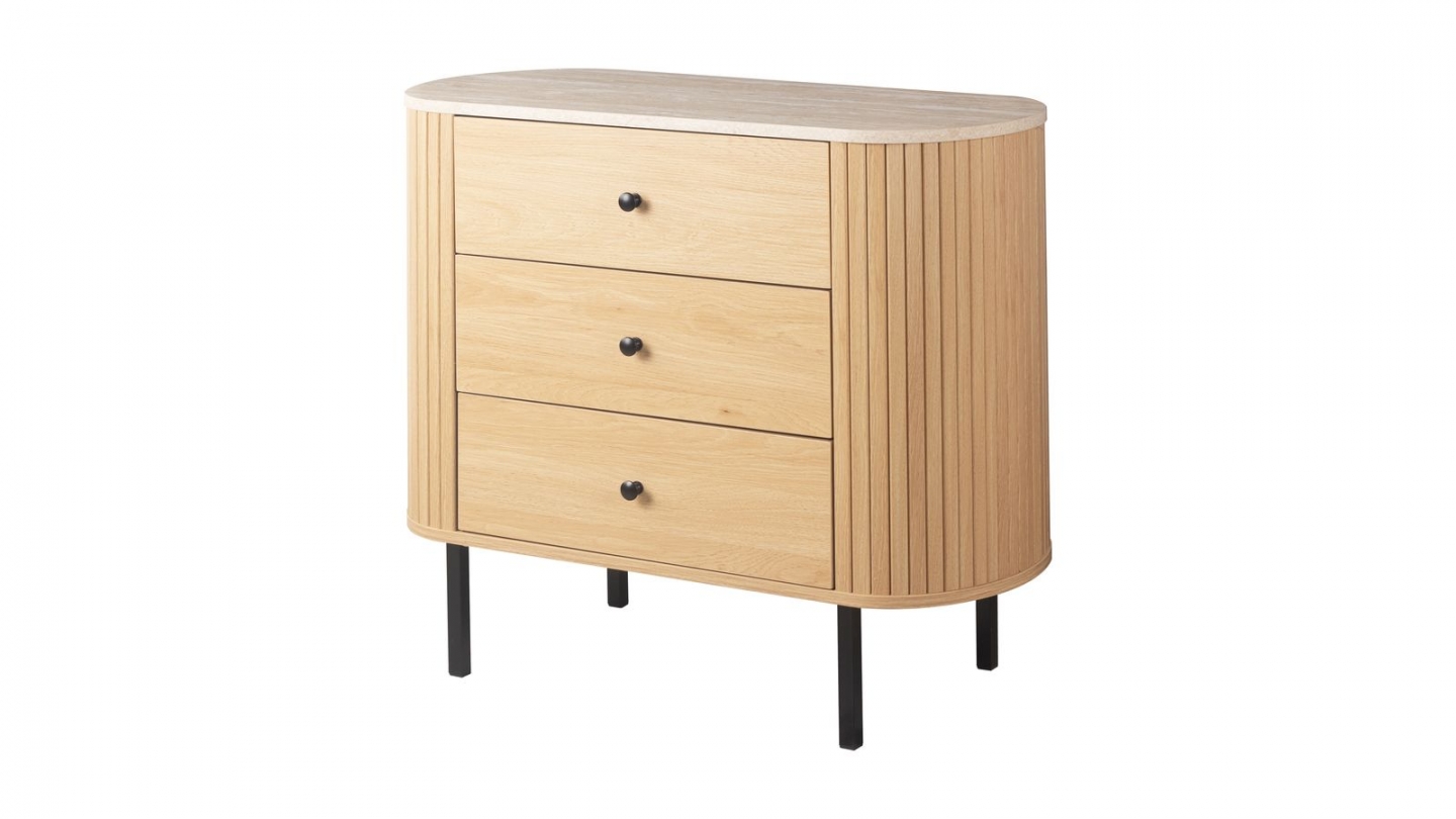 En stockCommode - Ida • Matière de la structure : Pin massif • Finition : Corps de meuble en bois peint. Plateau supérieur couleur bois. • Couleur : Blanc • Finition des tiroirs : Blanc • Piètement en Pin massif couleur blanc - hauteur 6.9 cm • Poignées : Métal noir • Rangements : 3 tiroirs • Dimensions totales : 100 x 40 x 80 cm • Dimensions des tiroirs :...