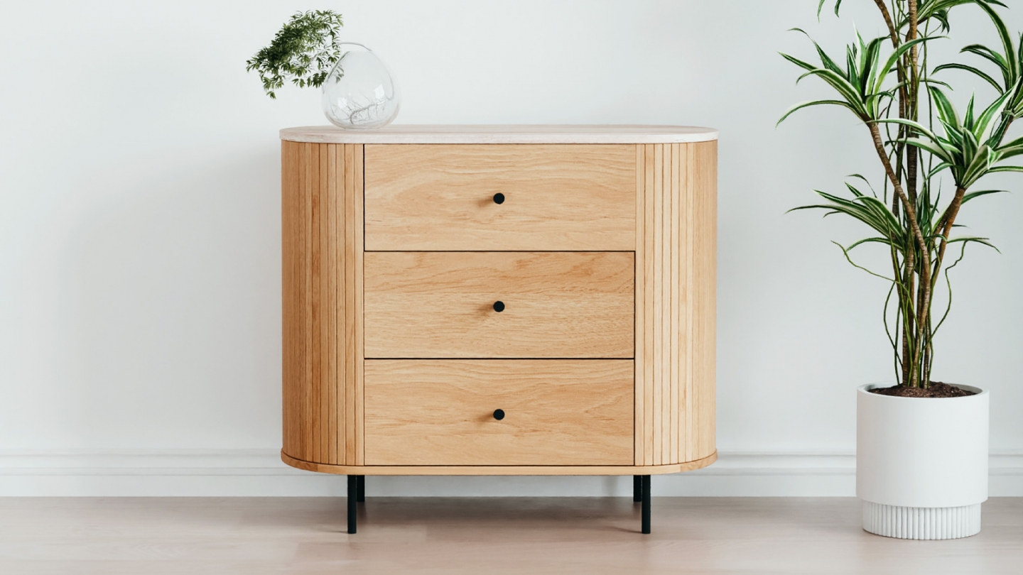 En stock•Commode 3 tiroirs•Couleur : Beige•Dimensions totales : H 93 x L 94 x P 52 cm•Hauteur du pied : 24 cm•Hauteur du tiroir : 22 cm•Largeur du tiroir : 90 cm•Matière : Pin certifié FSC•Livrée en1 colis