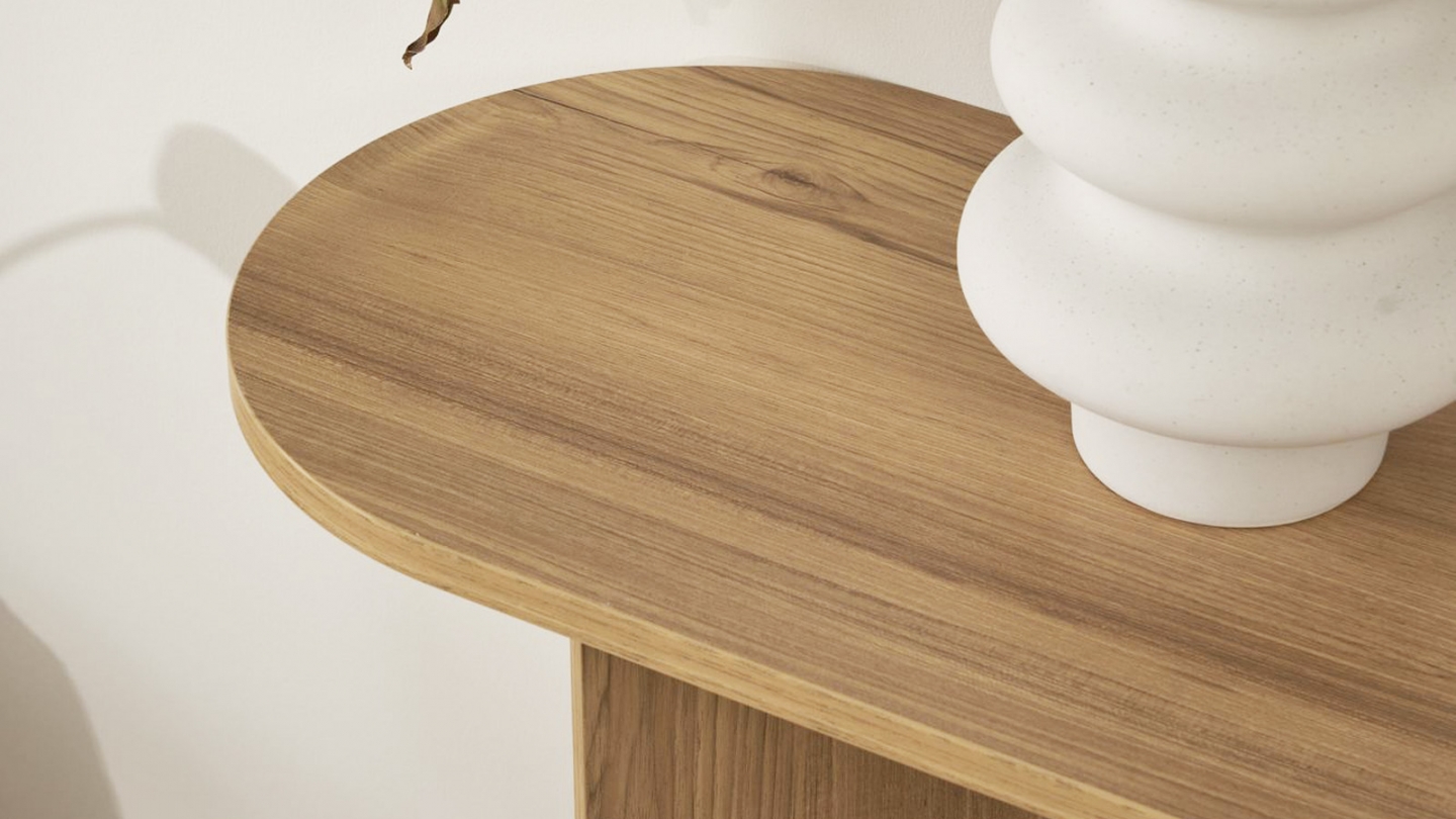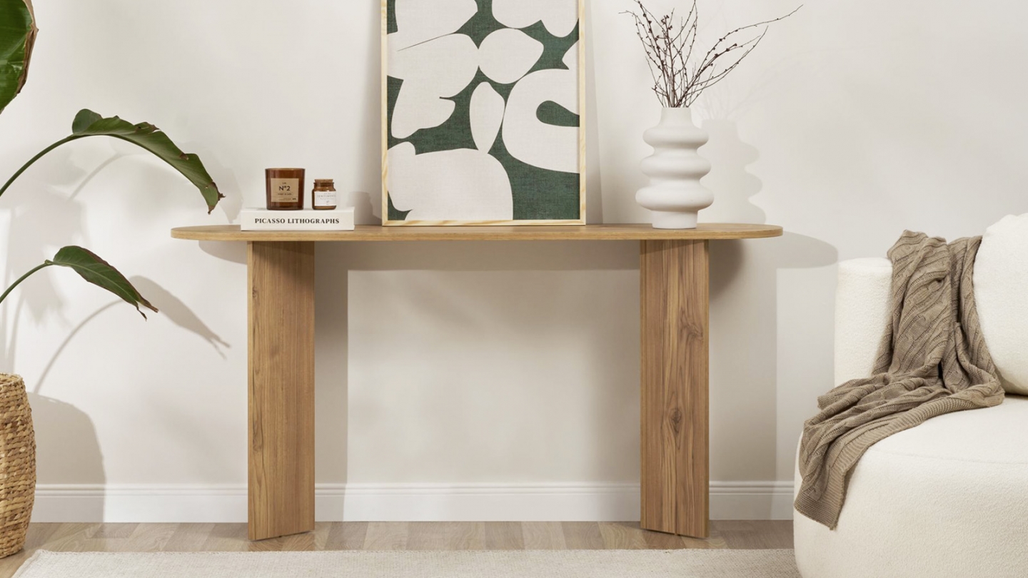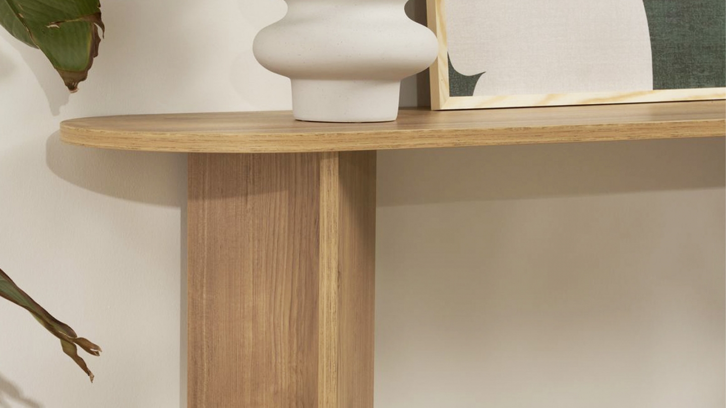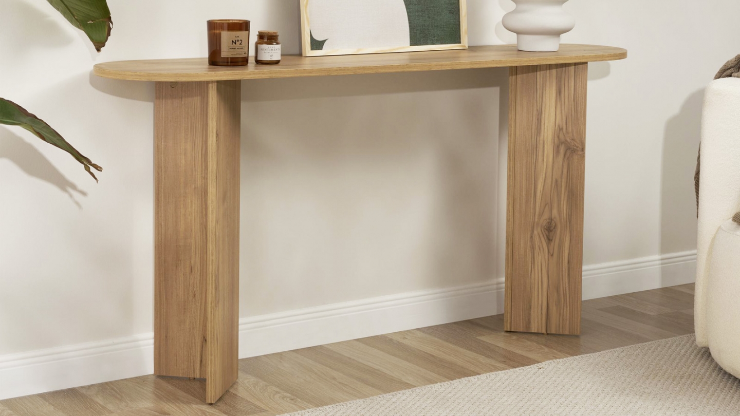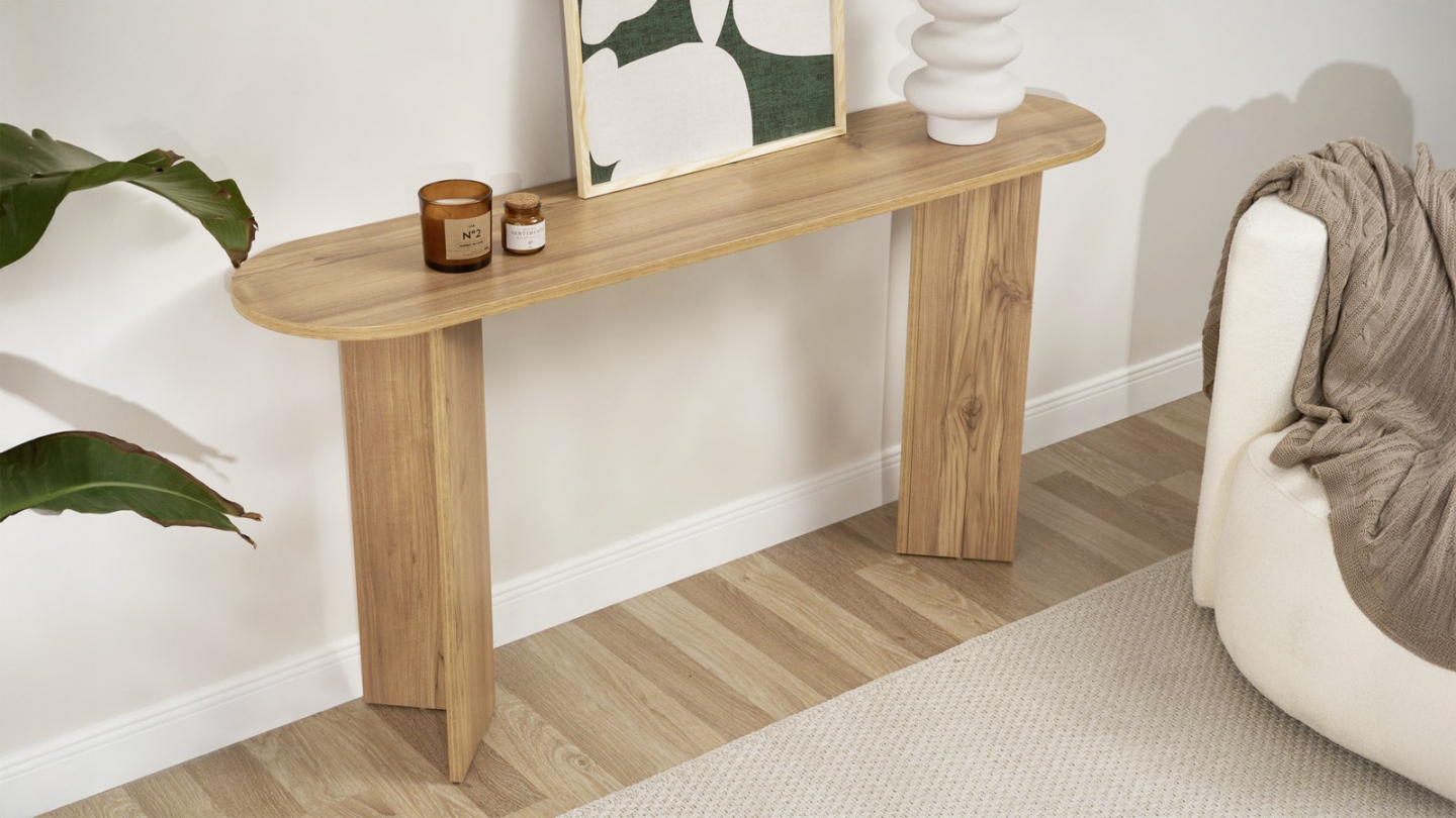 Console - Malva• Matière : Mélamine• Couleur : Effet bois blanc• Forme : ovale• Piètement en panneaux croisés assurant une parfaite stabilité et un style graphique moderne.• Dimensions totales : 150 x 35 x 75 cm