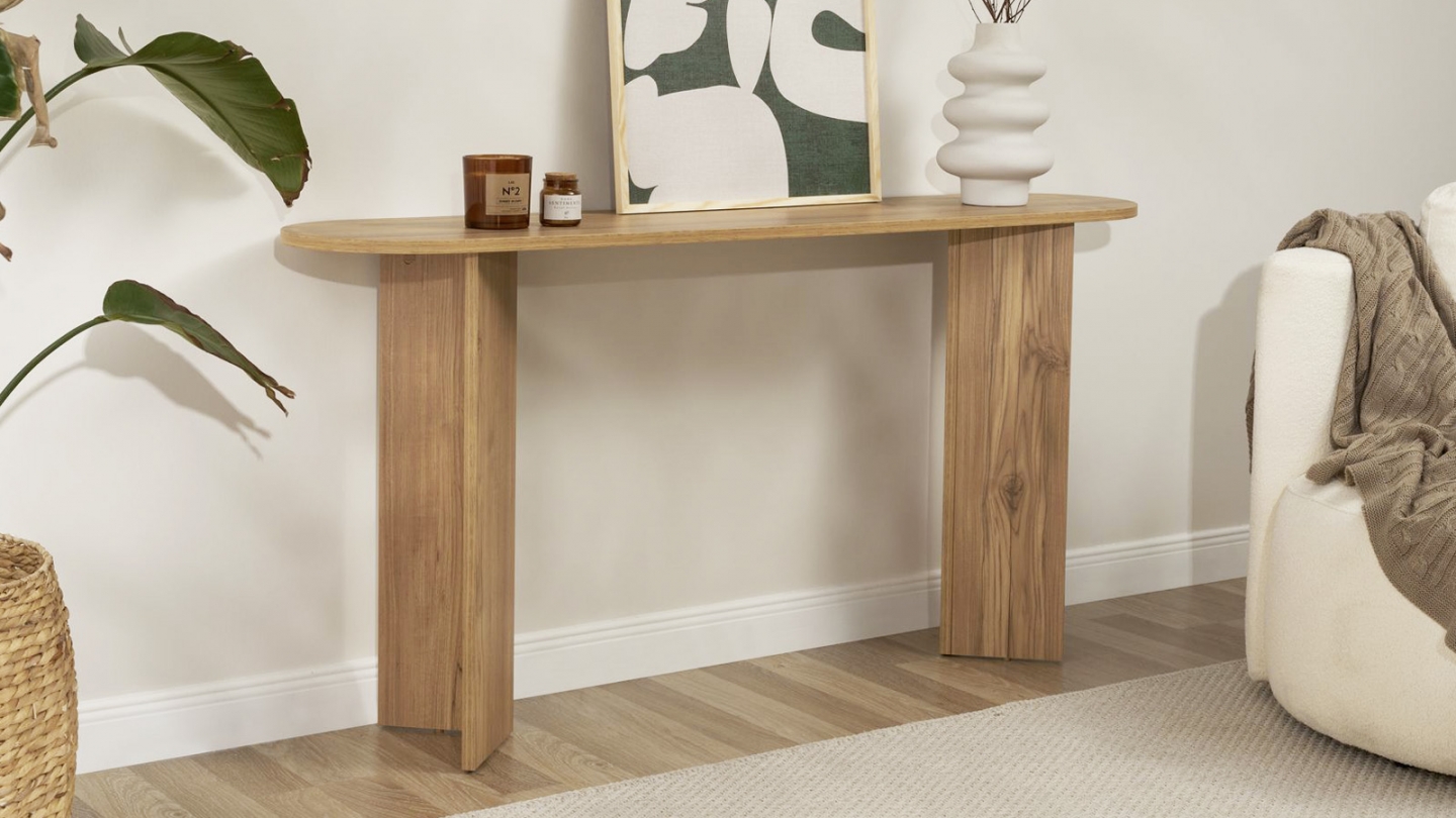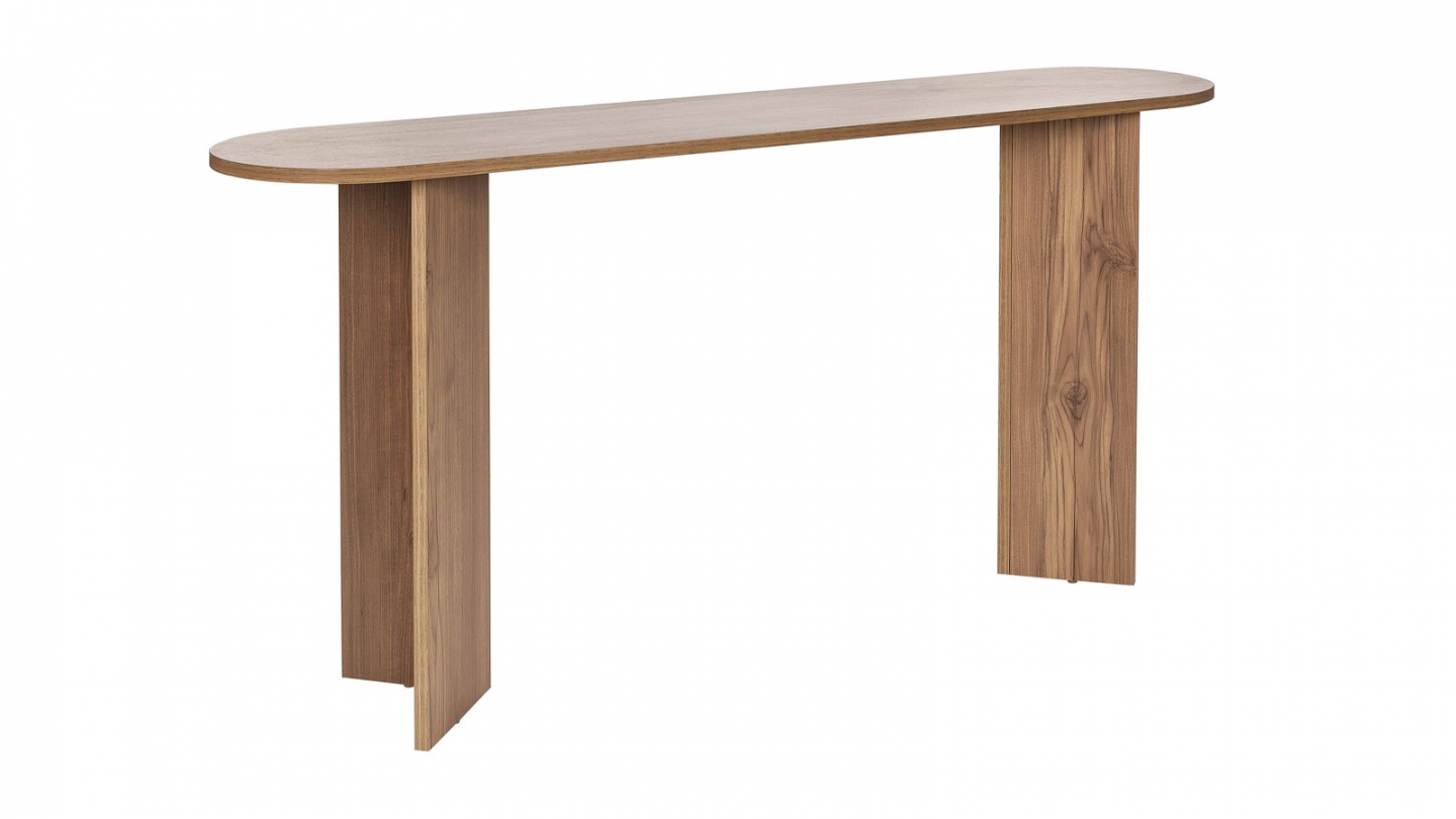 Console - Malva• Matière : Mélamine• Couleur : Effet Noyer• Forme : ovale• Piètement en panneaux croisés assurant une parfaite stabilité et un style graphique moderne.• Dimensions totales : 150 x 35 x 75 cm