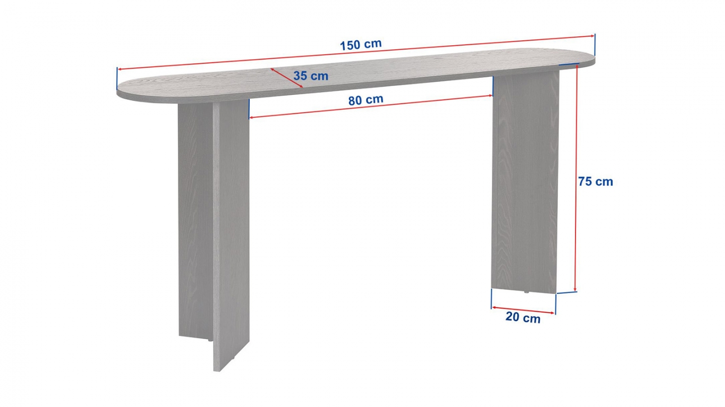 Console - Malva• Matière : Mélamine• Couleur : Effet travertin• Forme : ovale• Piètement en panneaux croisés assurant une parfaite stabilité et un style graphique moderne.• Dimensions totales : 150 x 35 x 75 cm