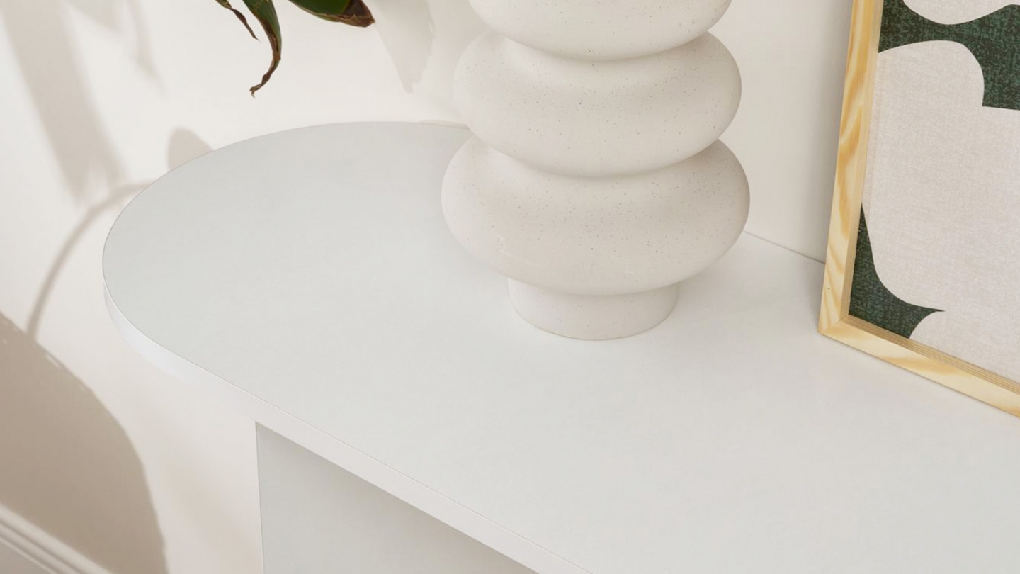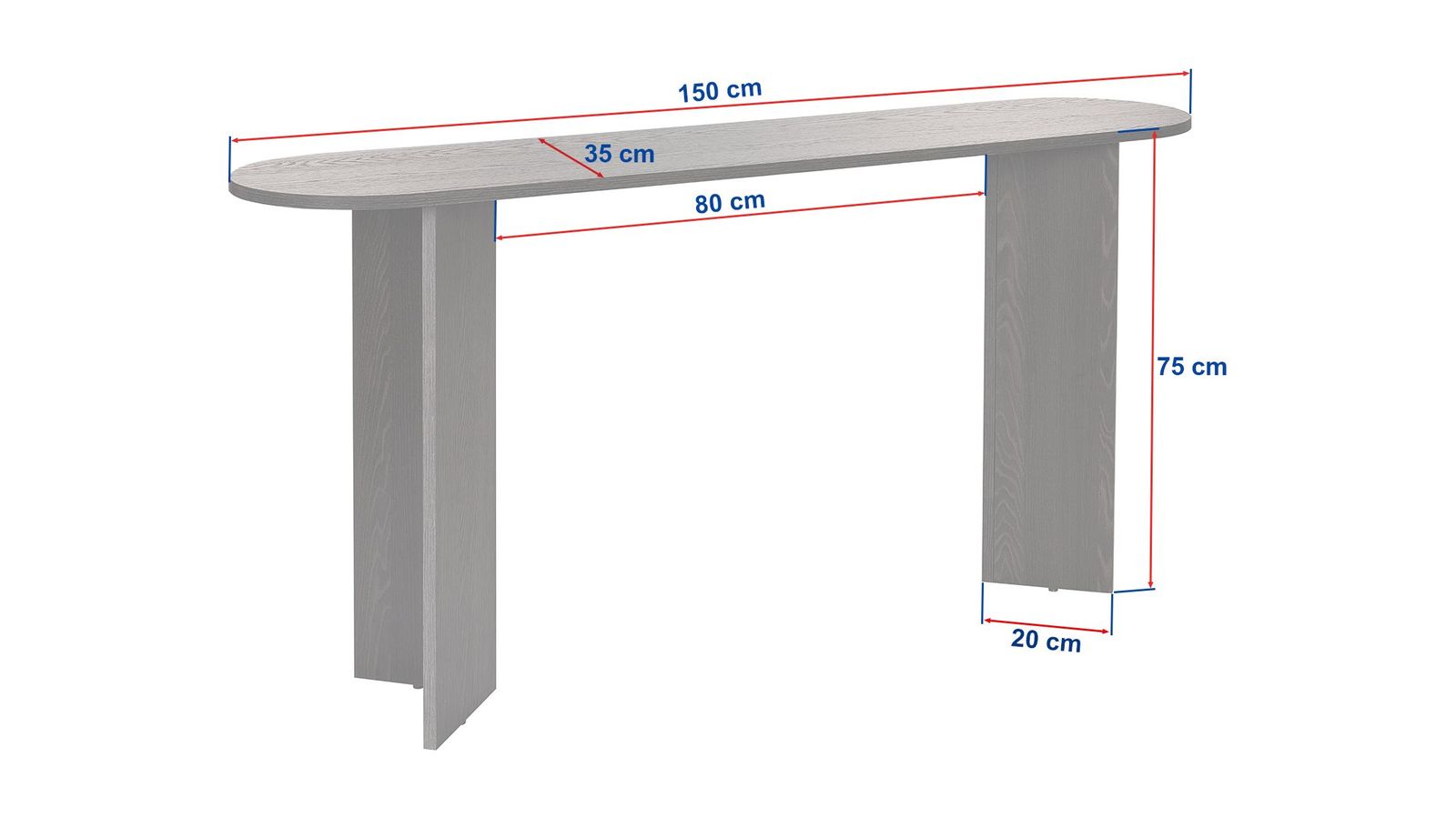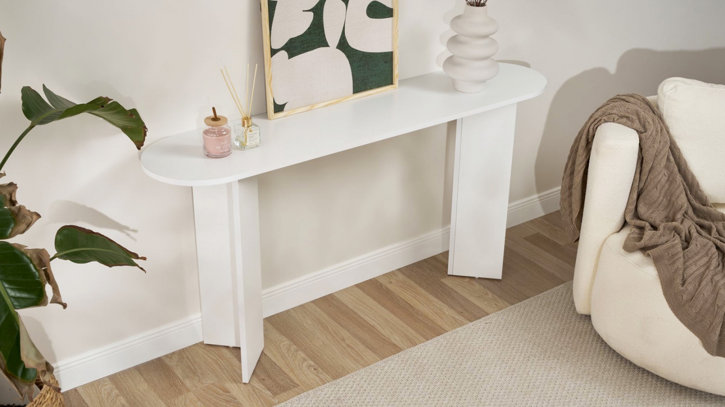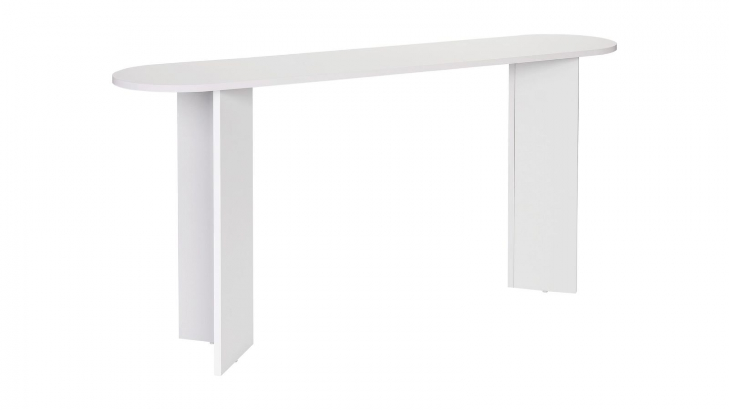 Console - Malva• Matière : Mélamine• Couleur : Effet travertin• Forme : ovale• Piètement en panneaux croisés assurant une parfaite stabilité et un style graphique moderne.• Dimensions totales : 150 x 35 x 75 cm