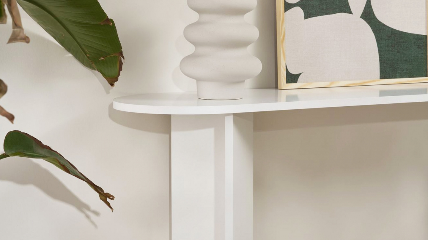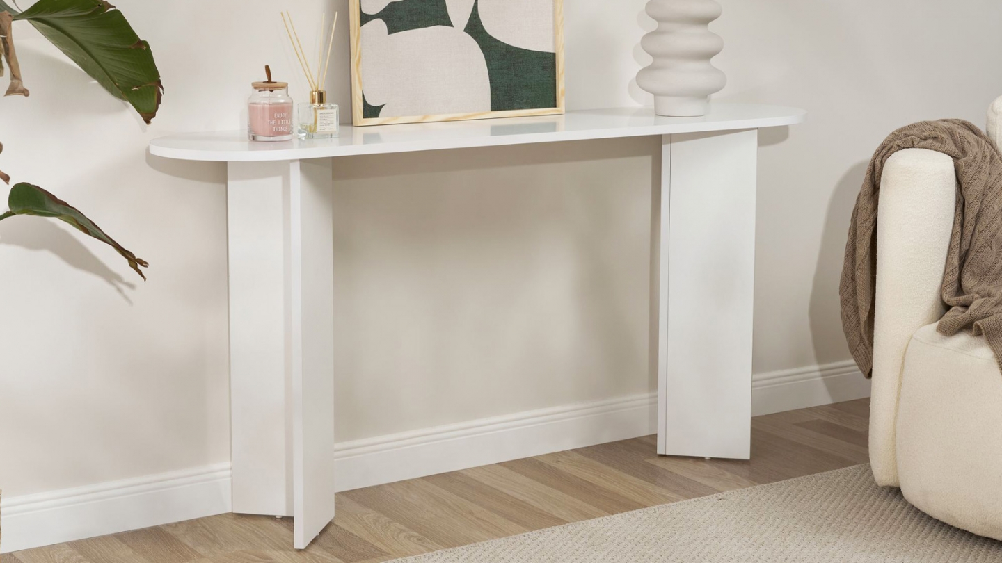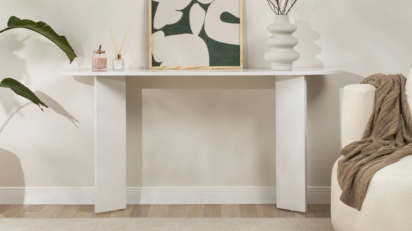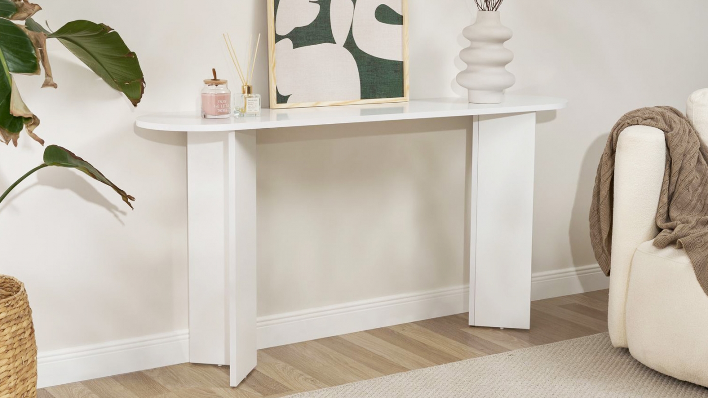 Console - Malva• Matière : Mélamine• Couleur : Effet travertin• Forme : ovale• Piètement en panneaux croisés assurant une parfaite stabilité et un style graphique moderne.• Dimensions totales : 150 x 35 x 75 cm