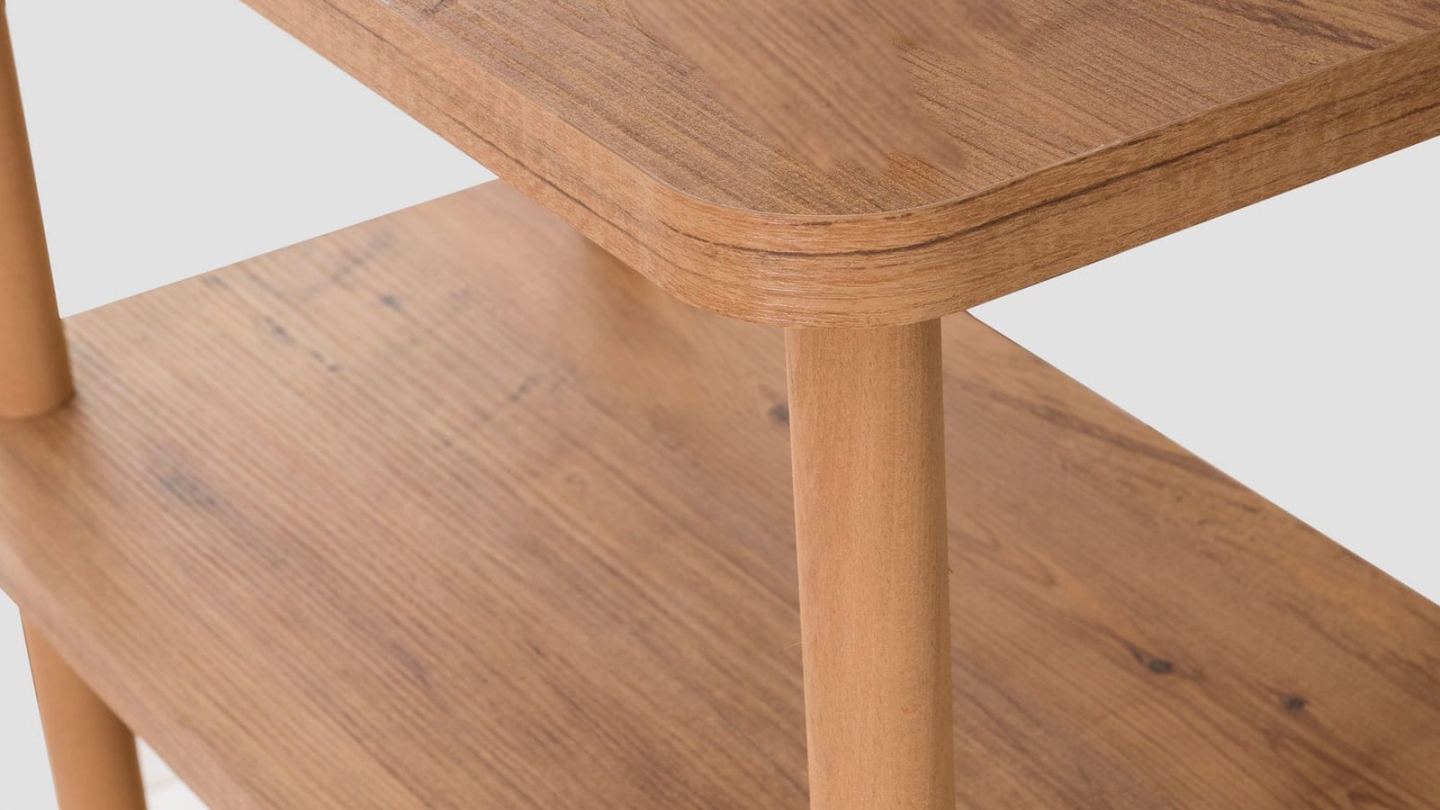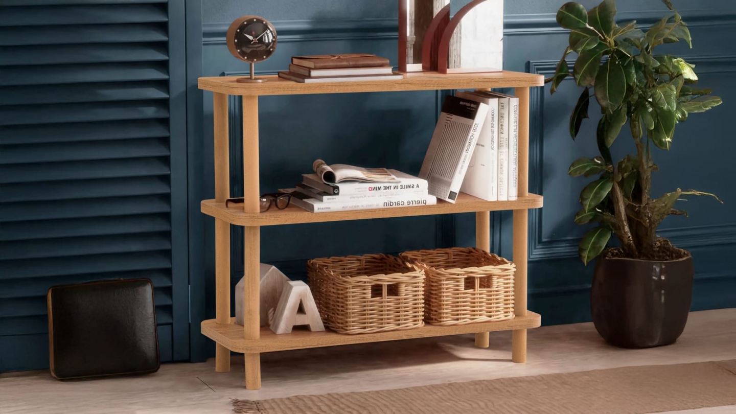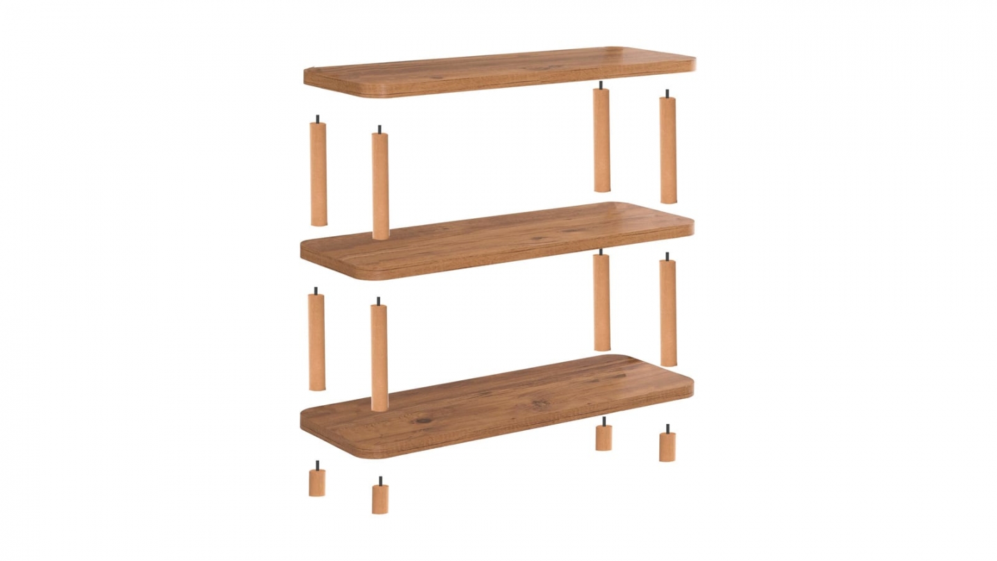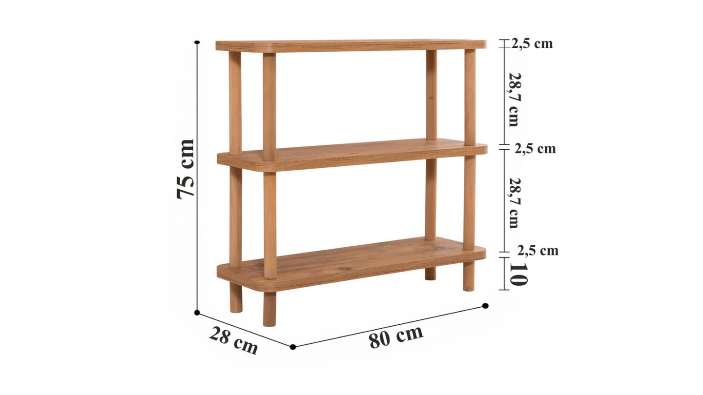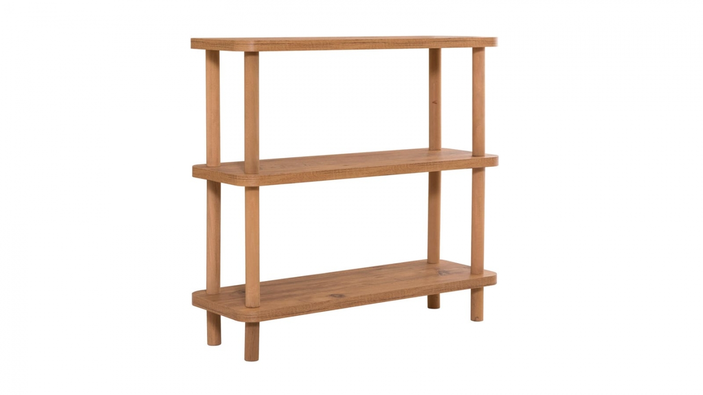 • Console en bois au design épuré, dotée de trois étagères ouvertes offrant un rangement à la fois pratique et décoratif, idéal pour les petits espaces.