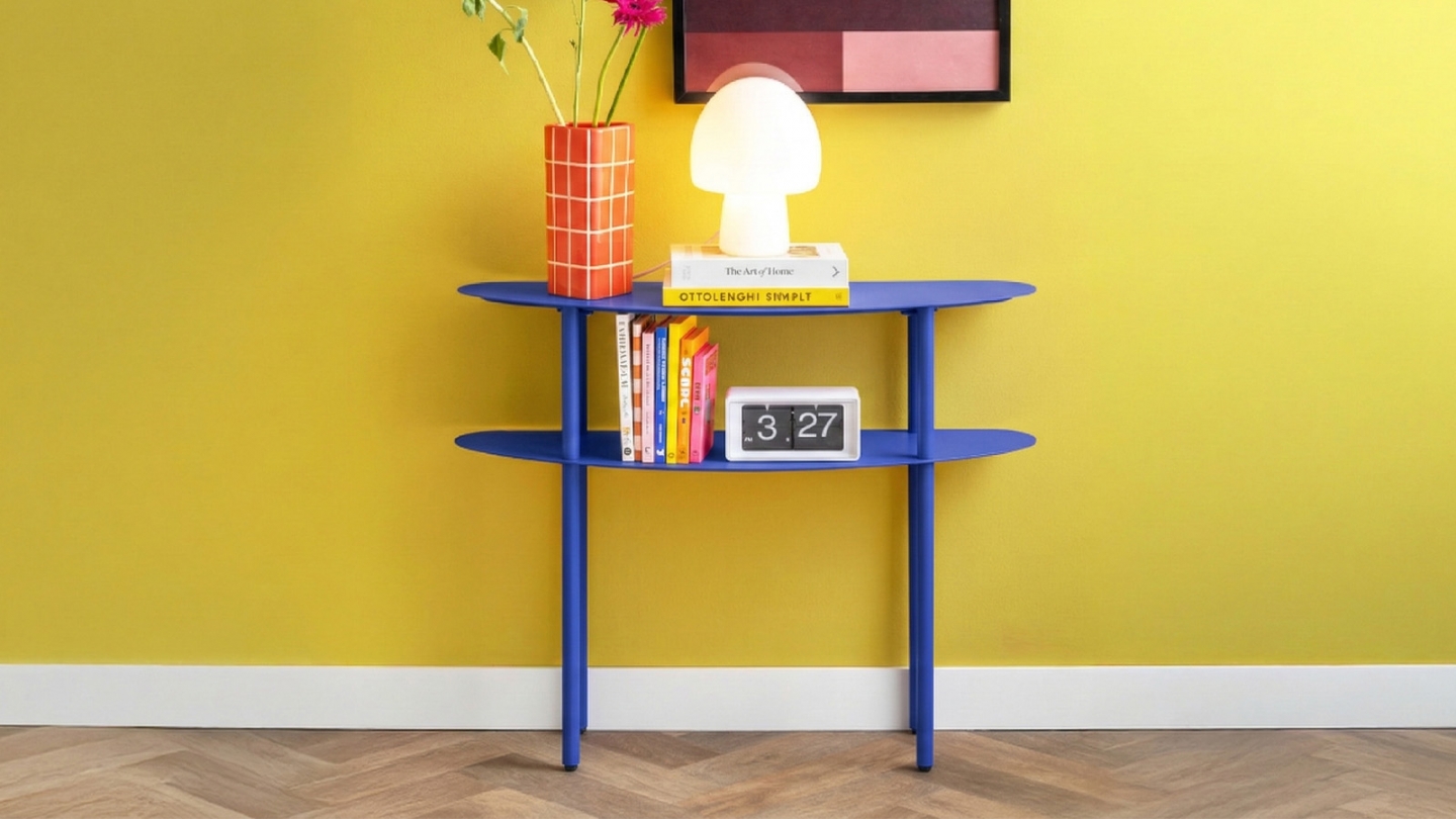 Une console en métal au design rétro graphique, compacte et stylée (L 90 cm × H 72,5 cm) qui apporte une touche fun et fonctionnelle à votre entrée ou salon.