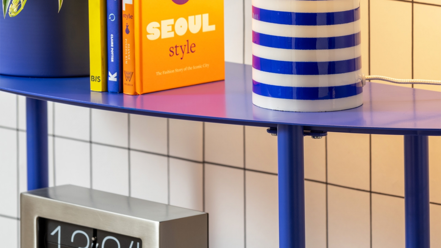 Etagère murale en métal bleu électrique - Cool Retro Une étagère murale en métal au look rétro graphique (H 42 cm × P 16 cm), parfaite pour exposer vos trésors et organiser vos espaces avec style. Disponible en quatre couleurs pour twister vos murs du salon au bureau. • Coloris : Bleu électrique • Dimensions : 16 x 60 x42 cm • Matière : Métal