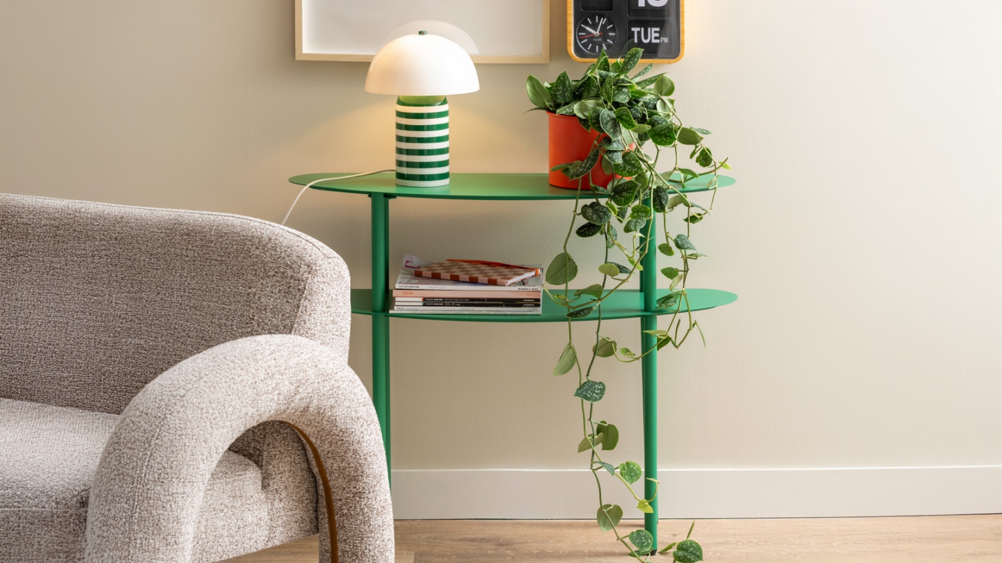 Une console en métal au design rétro graphique, compacte et stylée (L 90 cm × H 72,5 cm) qui apporte une touche fun et fonctionnelle à votre entrée ou salon.