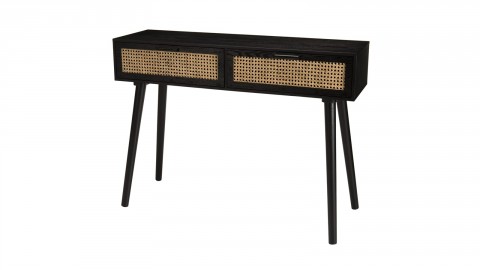 Rupture de stock• Console 2 tiroirs • Matière : MDF, rotin, pin • 2 tiroirs en cannage • Piètement en bois • Couleur : noir • Dimensions : 110 x 33 x 81.5 cm • Garantie 2 ans