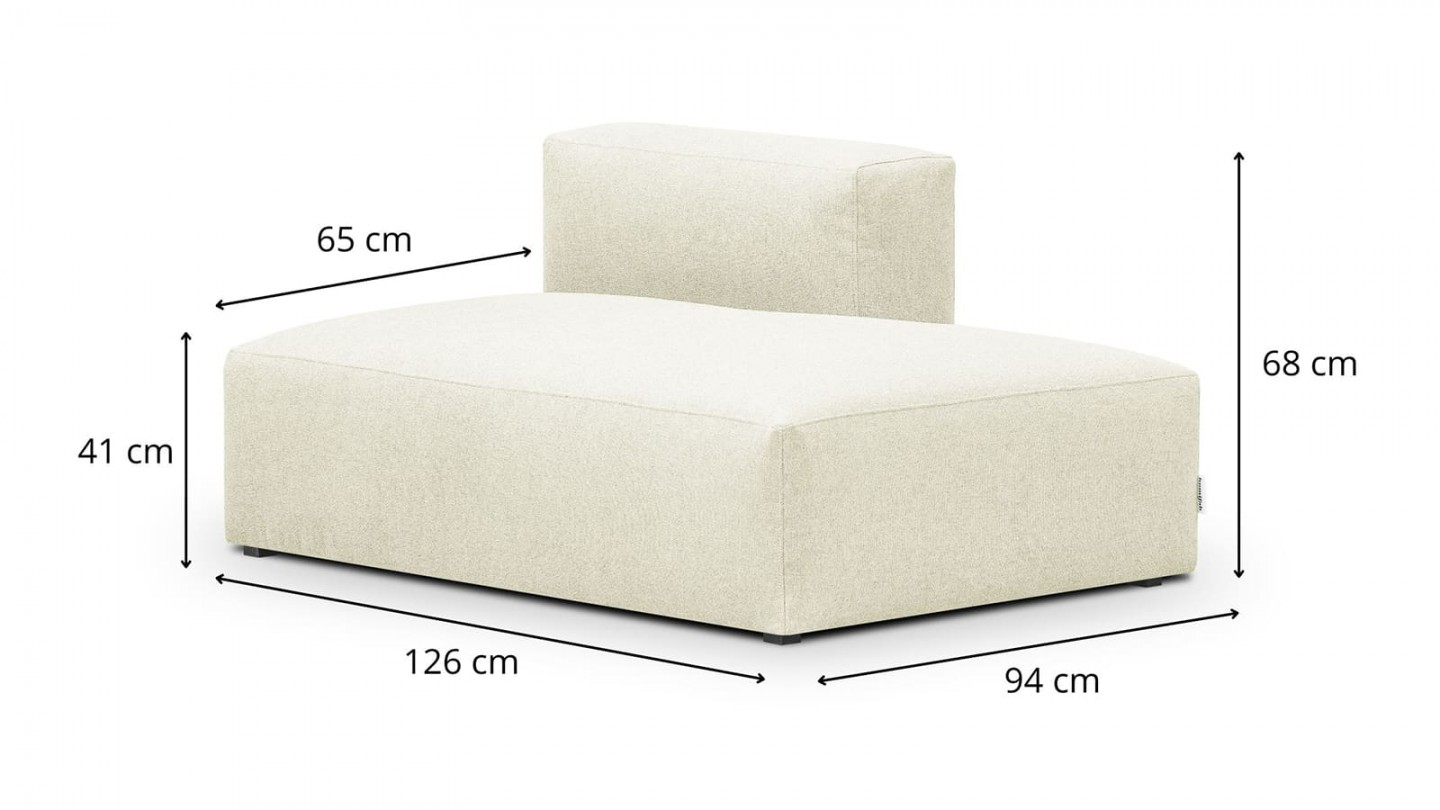 Cette méridienne reprend toutes les caractéristiques de la collection Modulo : une grande profondeur d'assise de 65cm, une assise composée de ressorts métalliques à plats avec une mousse haute résilience HR30kg.