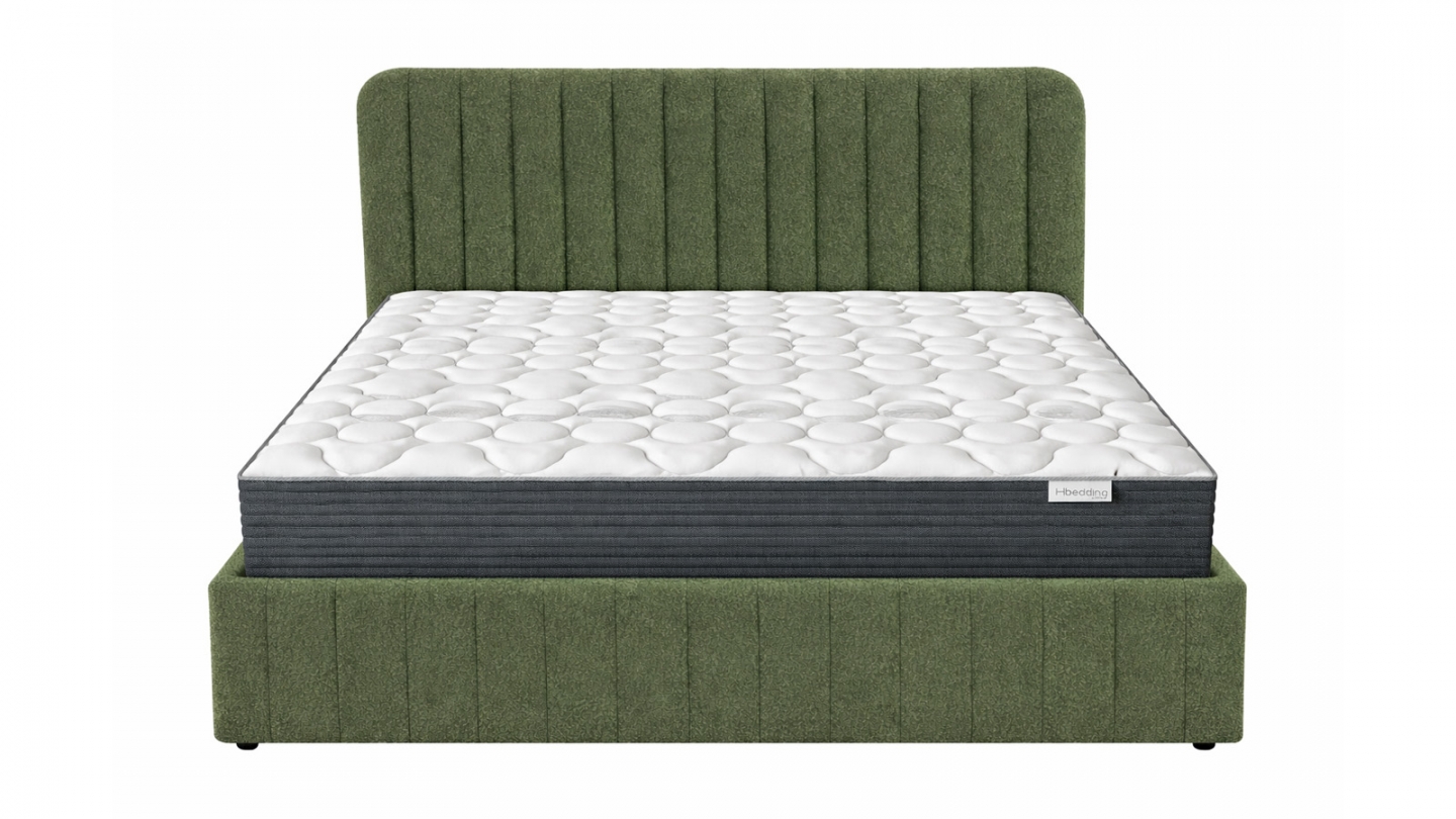Ensemble Lit adulte + matelasLit coffre en tissu bouclé - Ava • Structure : Bois, MDF • Revêtement : Tissu bouclé Oeko-Tex • Couleur : Vert • Garnissage : Mousse • Sommier coffre relevable 24 lattes • Dimensions du couchage : 140 x 190 cm • Dimensions totales : 206 x 152 x 32 cm • Dimensions de la tête de lit : 152x9x95 cm • Hauteur du cadre...