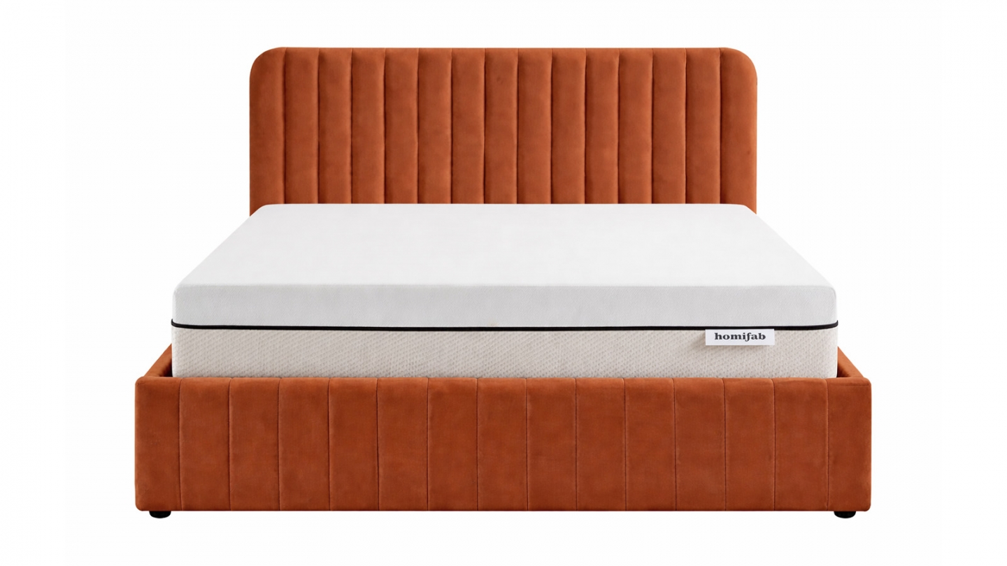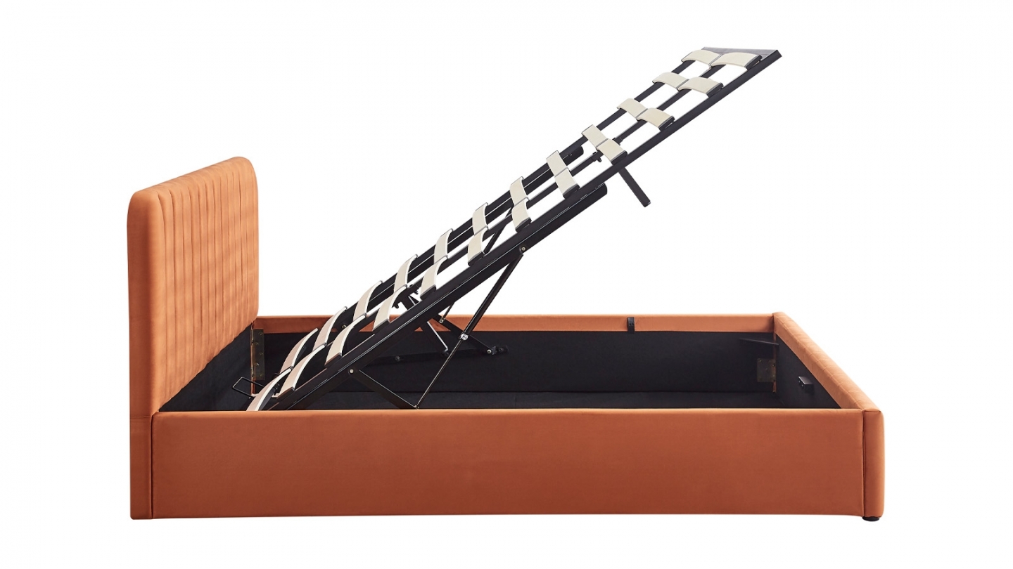Ensemble Lit adulte + matelasLit coffre en velours - Ava • Structure : MDF, bois massif • Revêtement : Velours 240 g/m² • Couleur : Terracotta • Avec tête de lit capitonnée + sommier • Garnissage : Mousse de polyuréthane 22 kg/m3 • Sommier coffre - 24 lattes - avec vérins • Dimensions du couchage : 140 x 190 cm • Dimensions totales : 206 x 152...