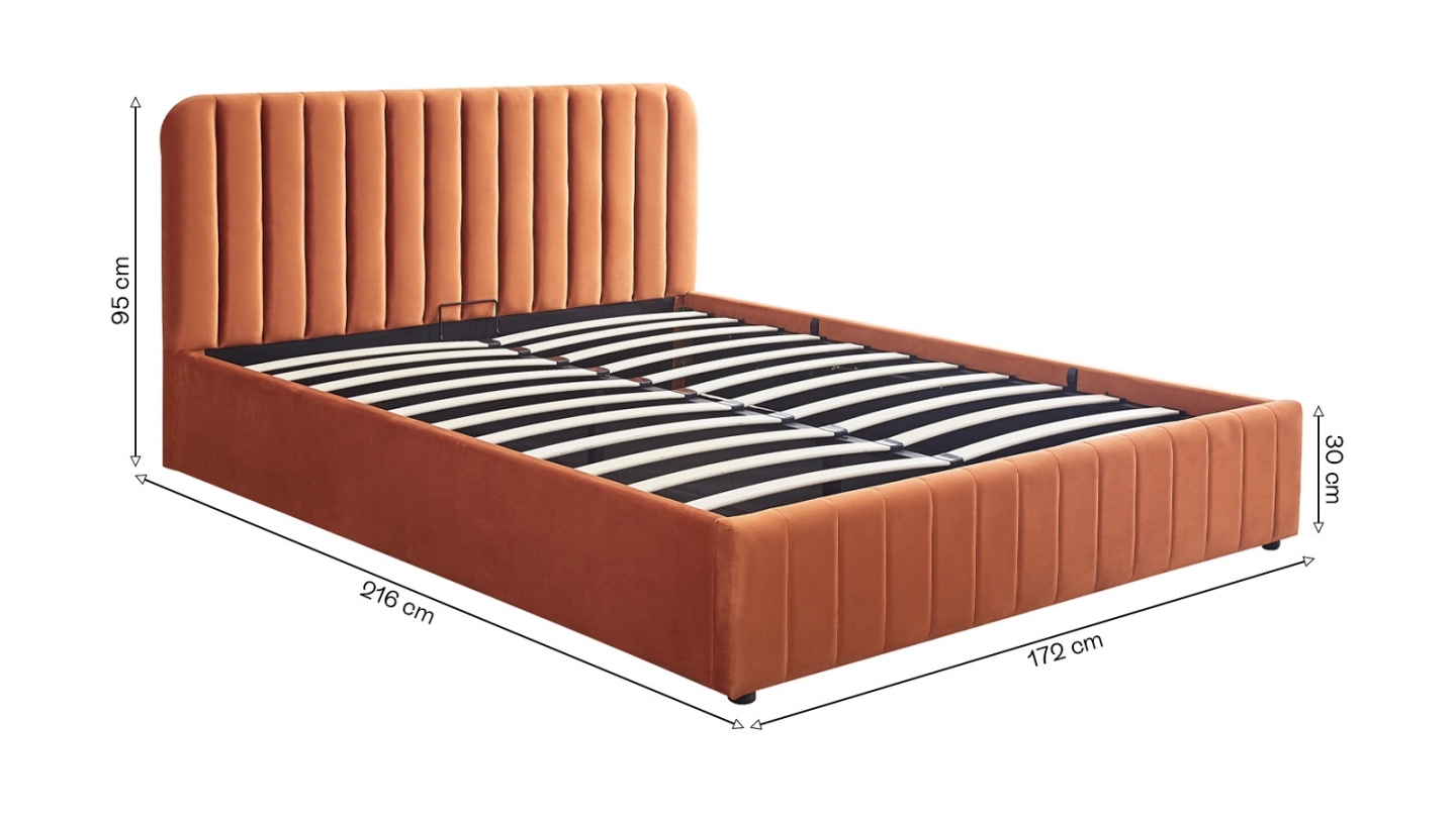 Ensemble Lit adulte + matelasLit coffre en velours - Ava • Structure : MDF, bois massif • Revêtement : Velours 240 g/m² • Couleur : Terracotta • Avec tête de lit capitonnée + sommier • Garnissage : Mousse de polyuréthane 22 kg/m3 • Sommier coffre - 24 lattes - avec vérins • Dimensions du couchage : 140 x 190 cm • Dimensions totales : 206 x 152...