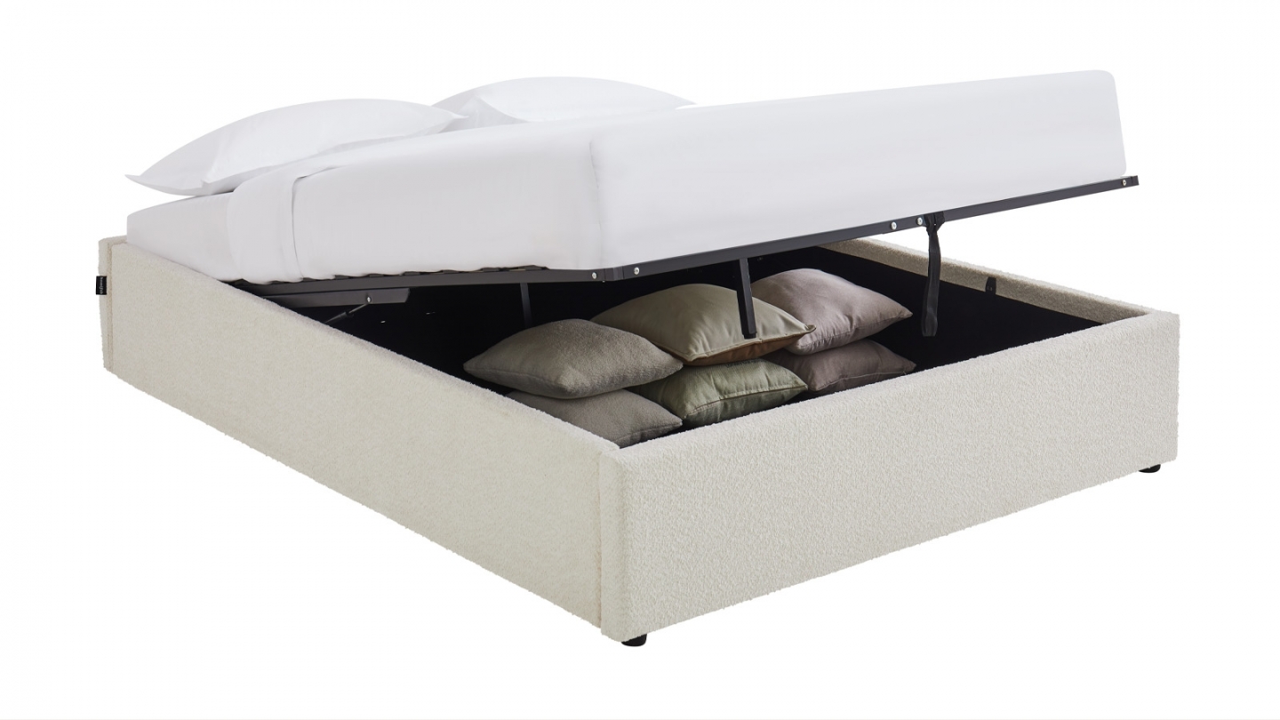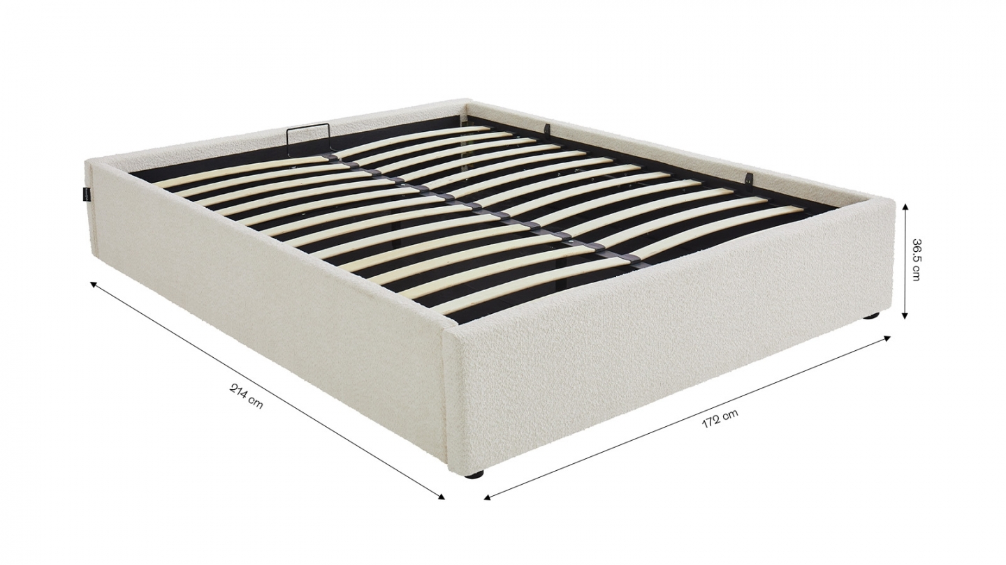 En stockEnsemble Lit adulte + matelas Lit coffre en tissu bouclé - Handy• Structure : Contreplaqué issu de bois FSC, métal• Revêtement : Tissu bouclé 530 g/m² certifié Oekotex®• Couleur : Beige• Avec sommier relevable à lattes• Garnissage : Mousse• Sommier 26 lattes (53x9 mm) en bois de peuplier• Dimensions du couchage : 140 x 190 cm• Dimensions totales : 204 x...