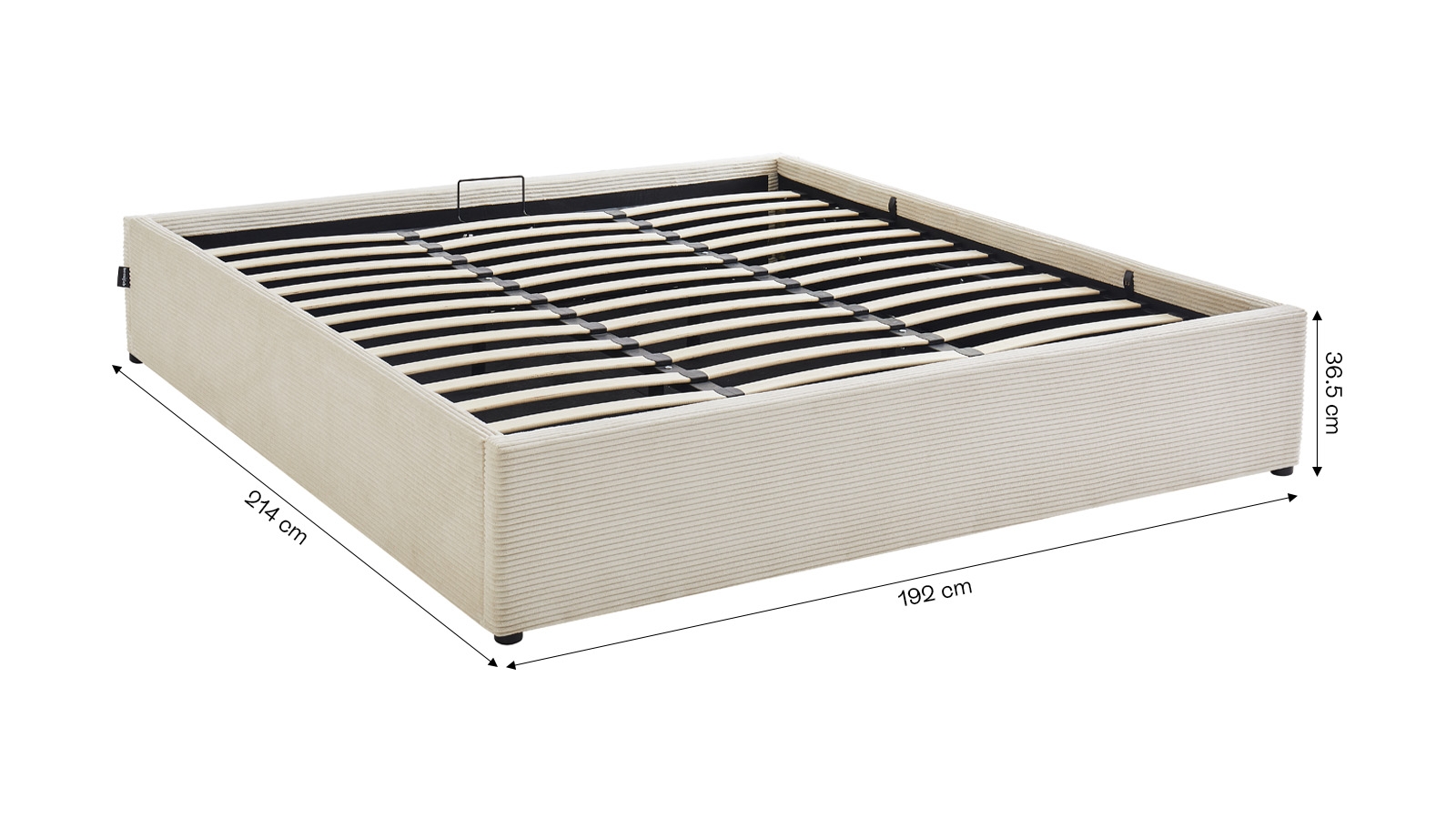 En stockEnsemble Lit adulte + matelas Lit coffre en velours côtelé - Handy• Structure : Contreplaqué issu de bois FSC, métal• Revêtement : Velours côtelé 380 g/m² certifié Oekotex®• Couleur : Beige• Avec sommier relevable à lattes• Garnissage : Mousse• Sommier 26 lattes (53x9 mm) en bois de peuplier• Dimensions du couchage : 140 x 190 cm• Dimensions totales :...