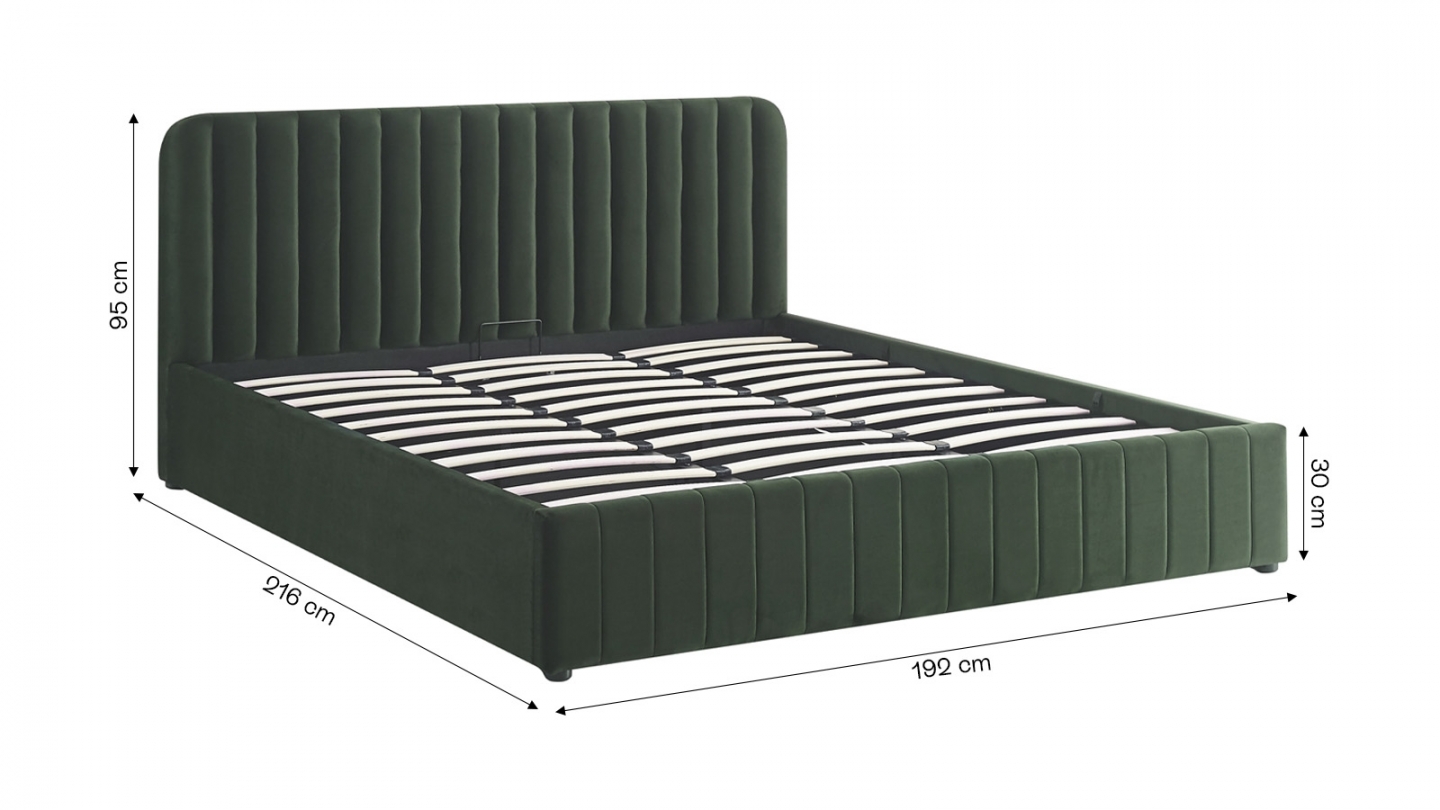 Ensemble Lit adulte + matelasLit coffre en tissu bouclé - Ava • Structure : Bois, MDF • Revêtement : Tissu bouclé Oeko-Tex • Couleur : Vert • Garnissage : Mousse • Sommier coffre relevable 36 lattes • Dimensions du couchage : 180 x 200 cm • Dimensions totales : 216 x 192 x 32 cm • Dimensions de la tête de lit : 192x9x95 cm • Hauteur du cadre...