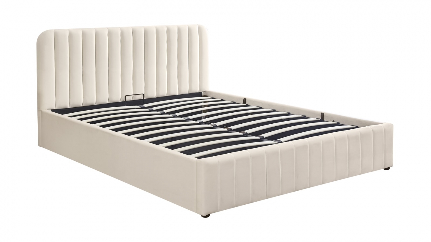 Ensemble Lit adulte + matelasLit coffre en velours - Ava • Structure : MDF, bois massif • Revêtement : Velours 240 g/m² • Couleur : Beige • Avec tête de lit capitonnée + sommier • Garnissage : Mousse de polyuréthane 22 kg/m3 • Sommier coffre - 24 lattes - avec vérins • Dimensions du couchage : 160 x 200 cm • Dimensions totales : 216 x 172 x 95...